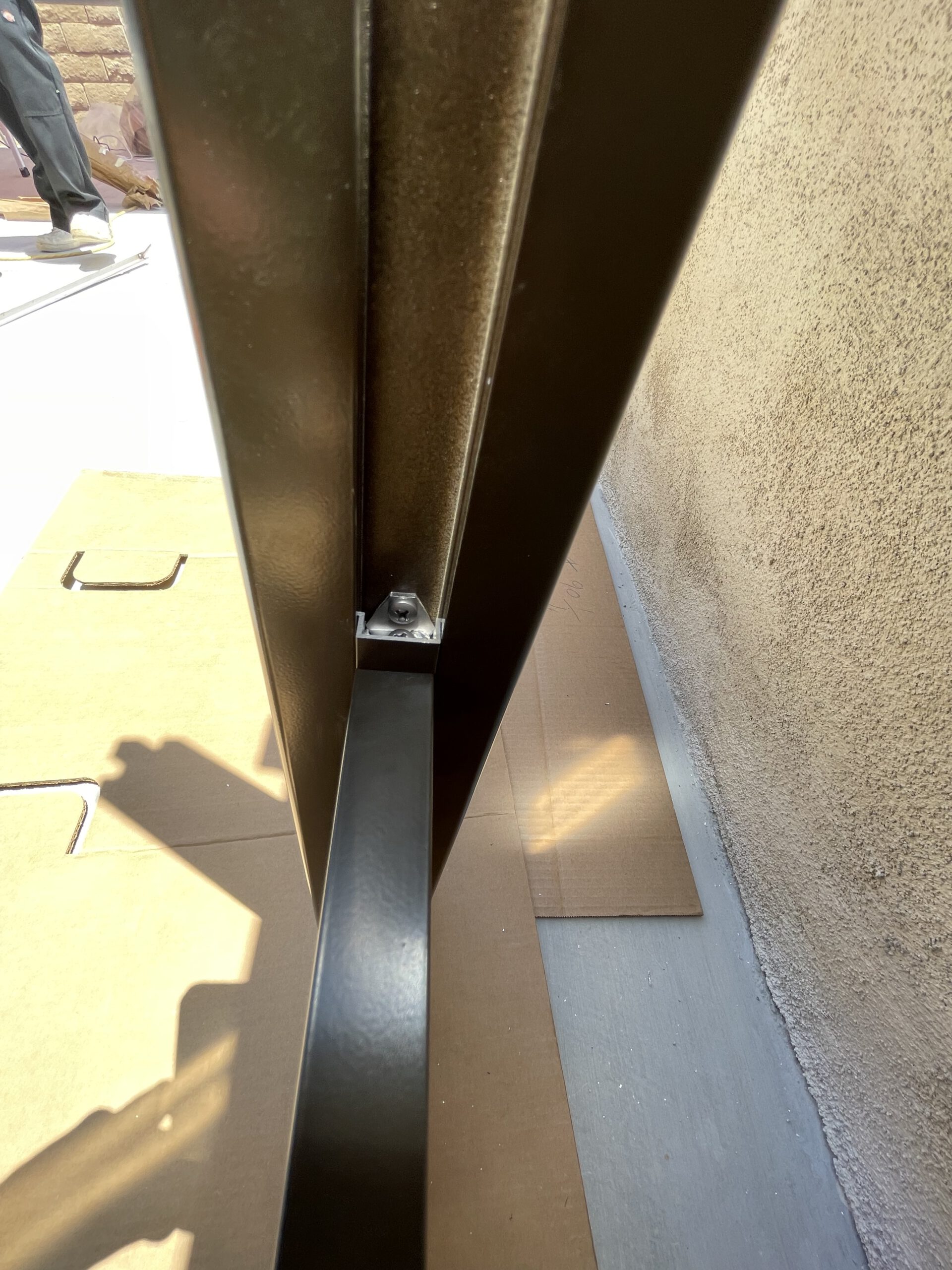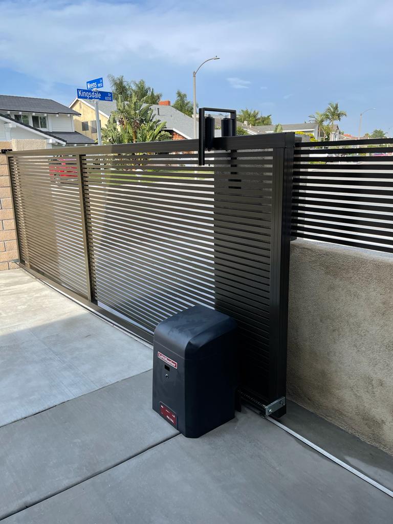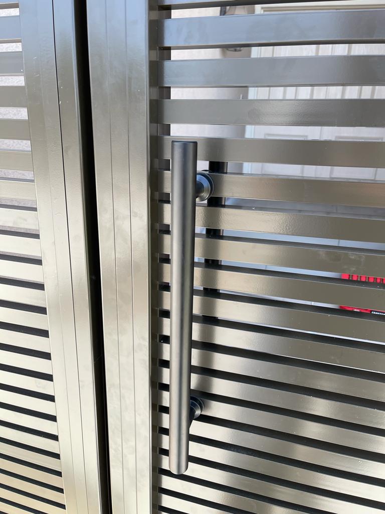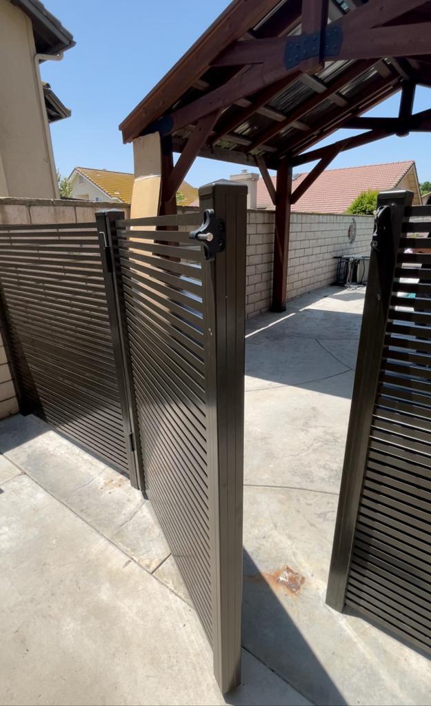 Aluminum pedestrian gate at 4’ height, wall topper of 2’ height and 10’x4’ height sliding gate. All made with 1” slats and ½” spacers. Looks very modern and stylish. These panels are spaced so that a glimpse of the surroundings beyond can be seen between them, expanding and framing the view of the garden.