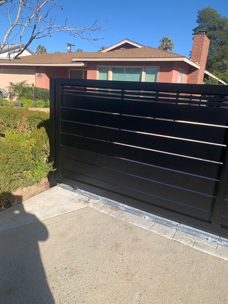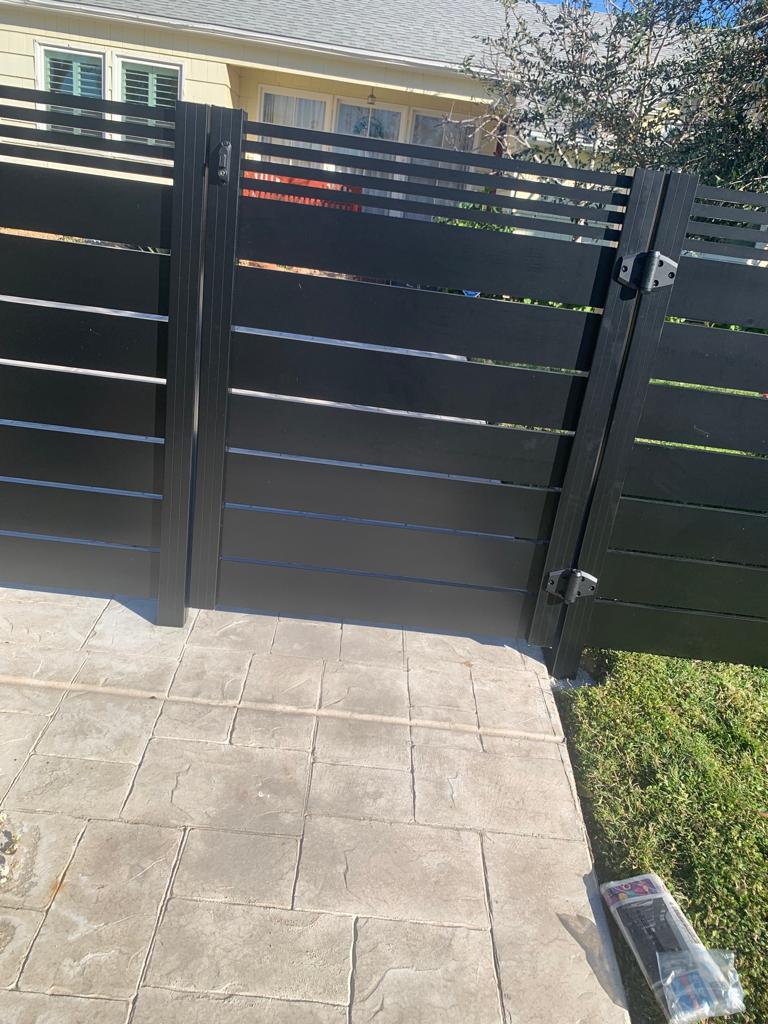 Flat black aluminum fence with pedestrian gate and driveway sliding gate. All the project was design with Dallas Style, 5.5” aluminum slats with ½” spacers on the bottom and last 8”-10” made with 1” aluminum slats and ½” spacers. The aluminum pedestrian gate is semi framed and the sliding gate is fully framed. The fence can also be customized to suit one’s own tastes, with a variety of styles and colors available.