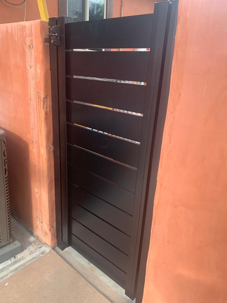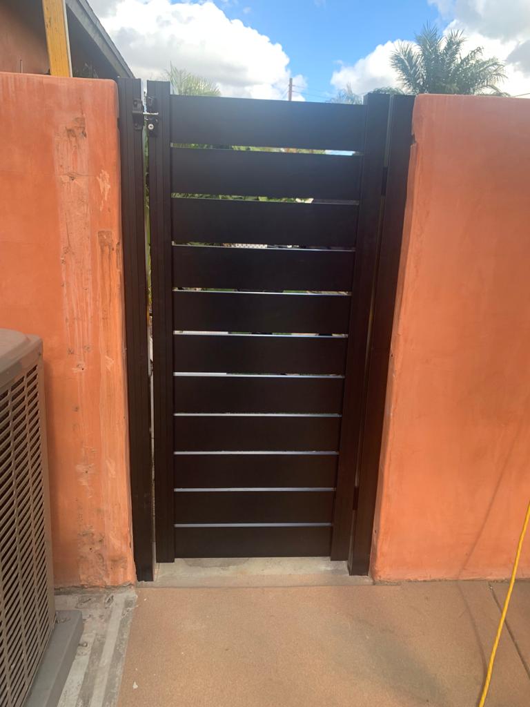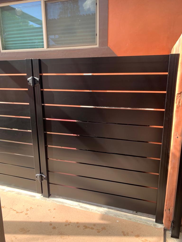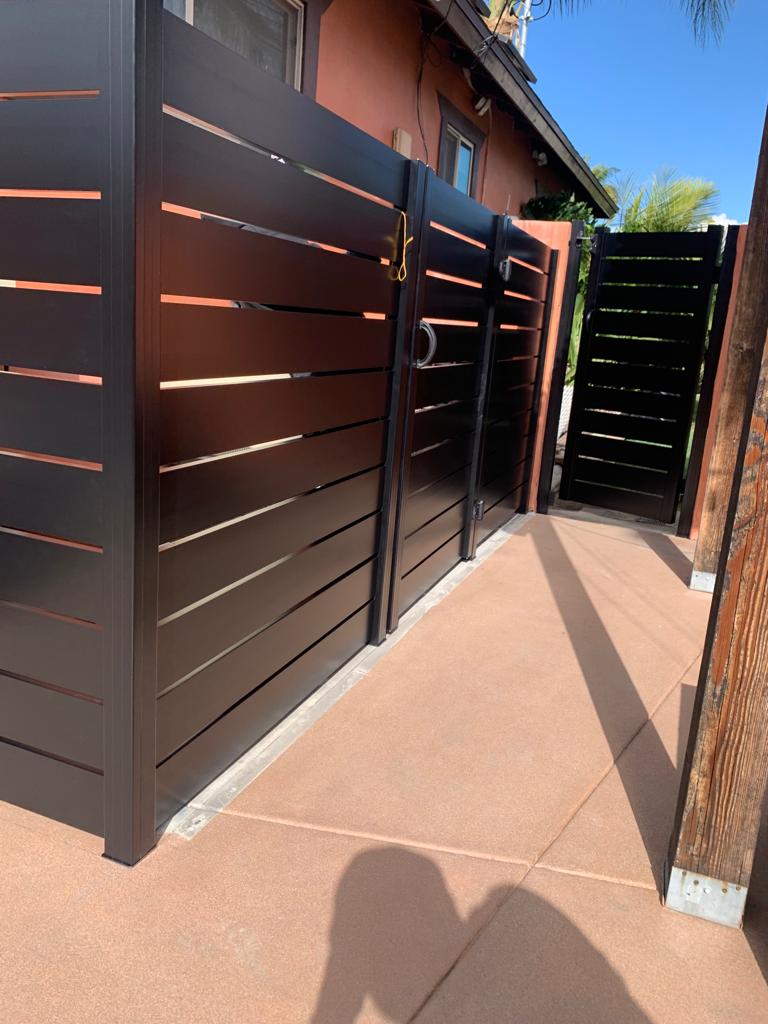 Flat black horizontal fence and gate. Made with 5.5” aluminum slats and ½” spacers (Los Angeles Style). The corrosion resistance and rust resistance of aluminum make this aluminum fence incomparable to steel or wood fences in terms of corroding and rusting.