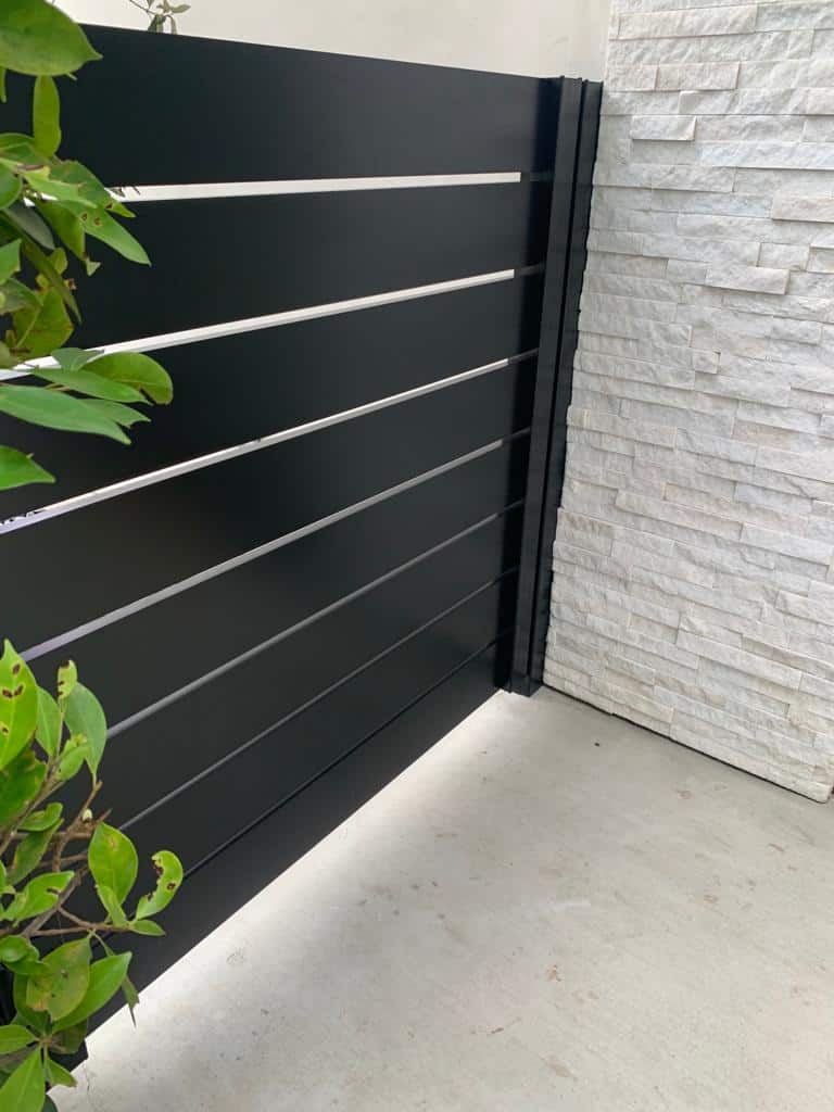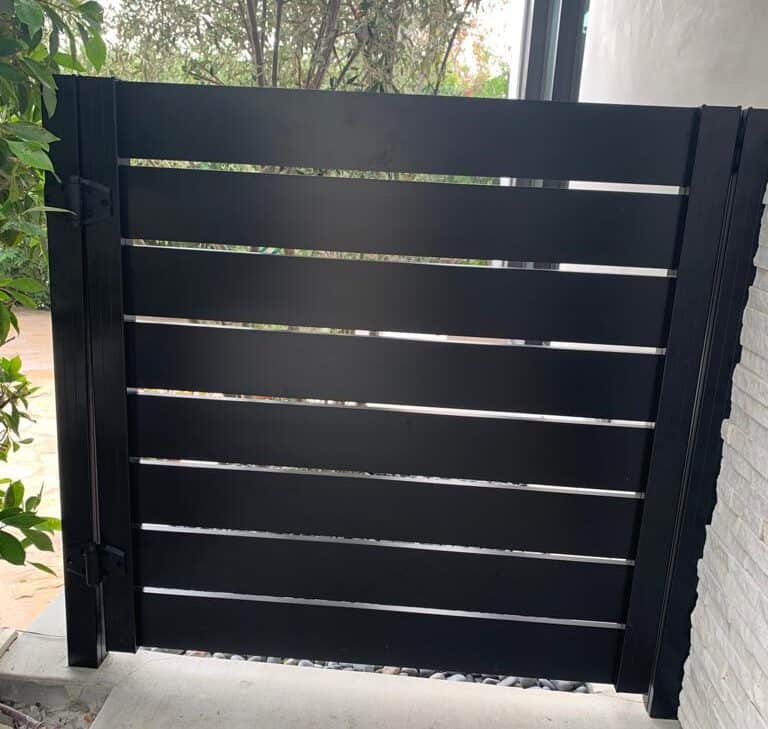 Modern classic aluminum slate gate made with 5.5” slats and ½” spacers. Very popular design. The color is flat black and the sizes of the gate is 4’x4’ height.