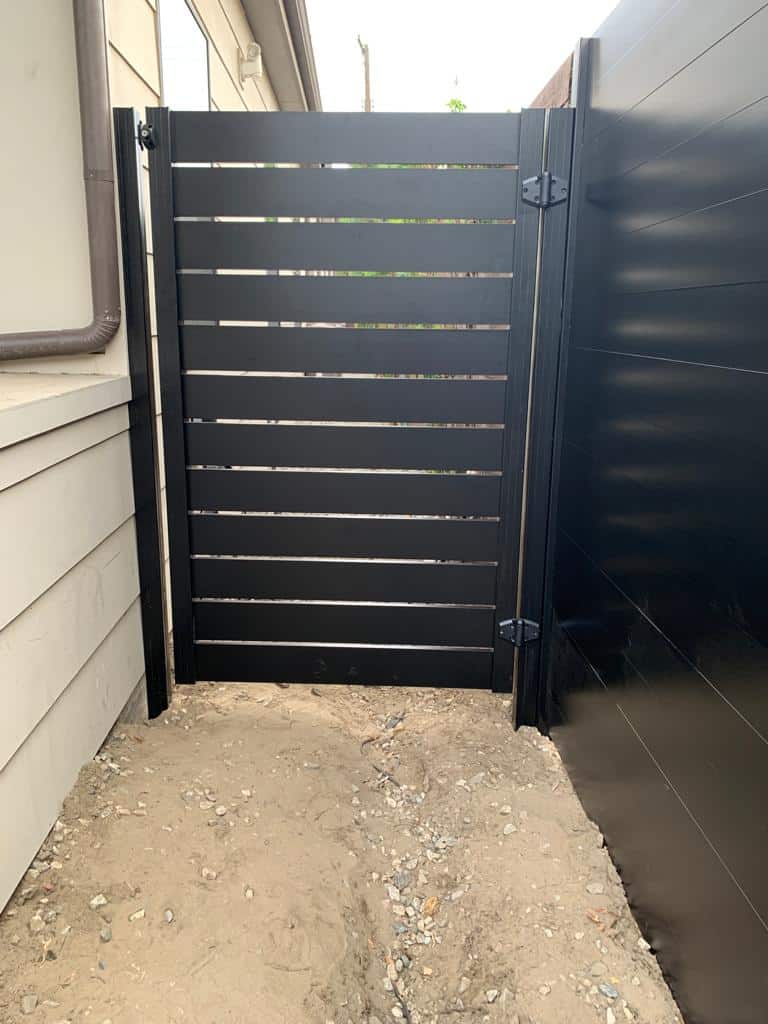6’ full privacy aluminum slat fence and 6’ full privacy aluminum slat wall topper, both made from 5.5” slats without any gap between. The aluminum wall topper has another 1” slat with 1” space from the full privacy fence to add a little for the design. The side yard fence made almost the same but semi privacy with ½” spacers between the aluminum slats.