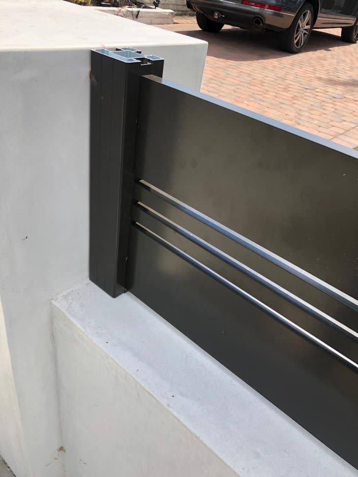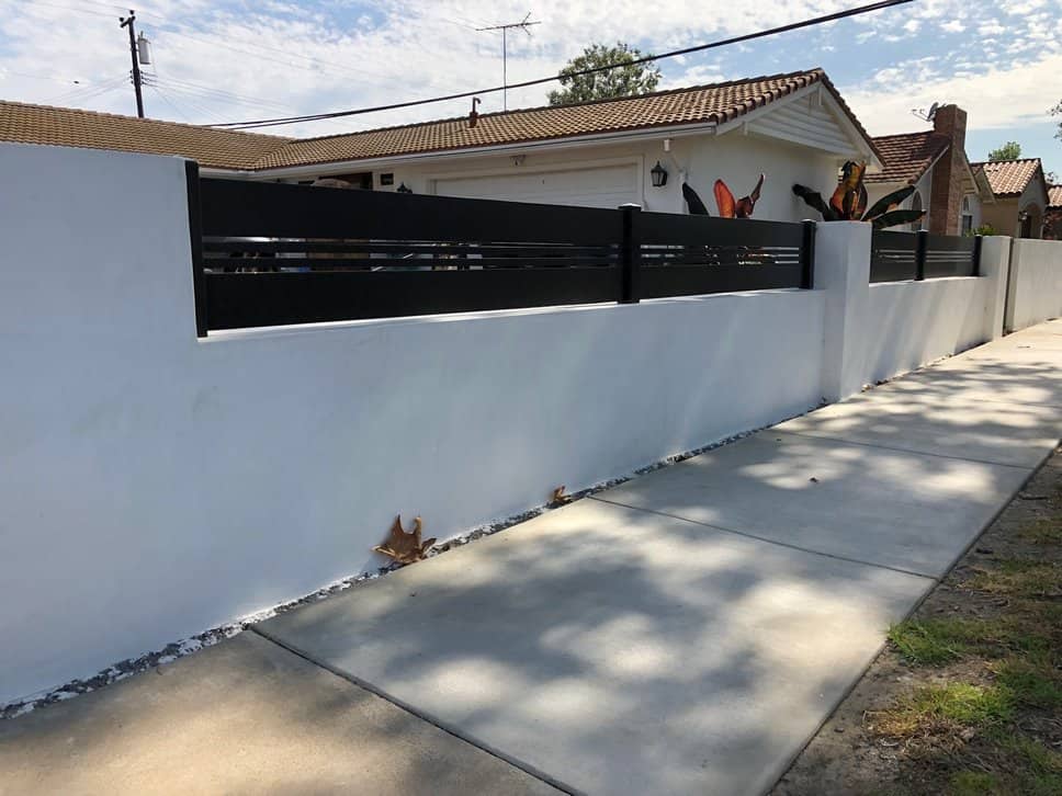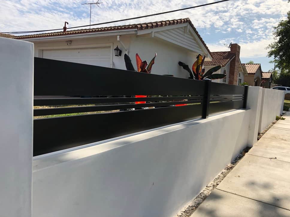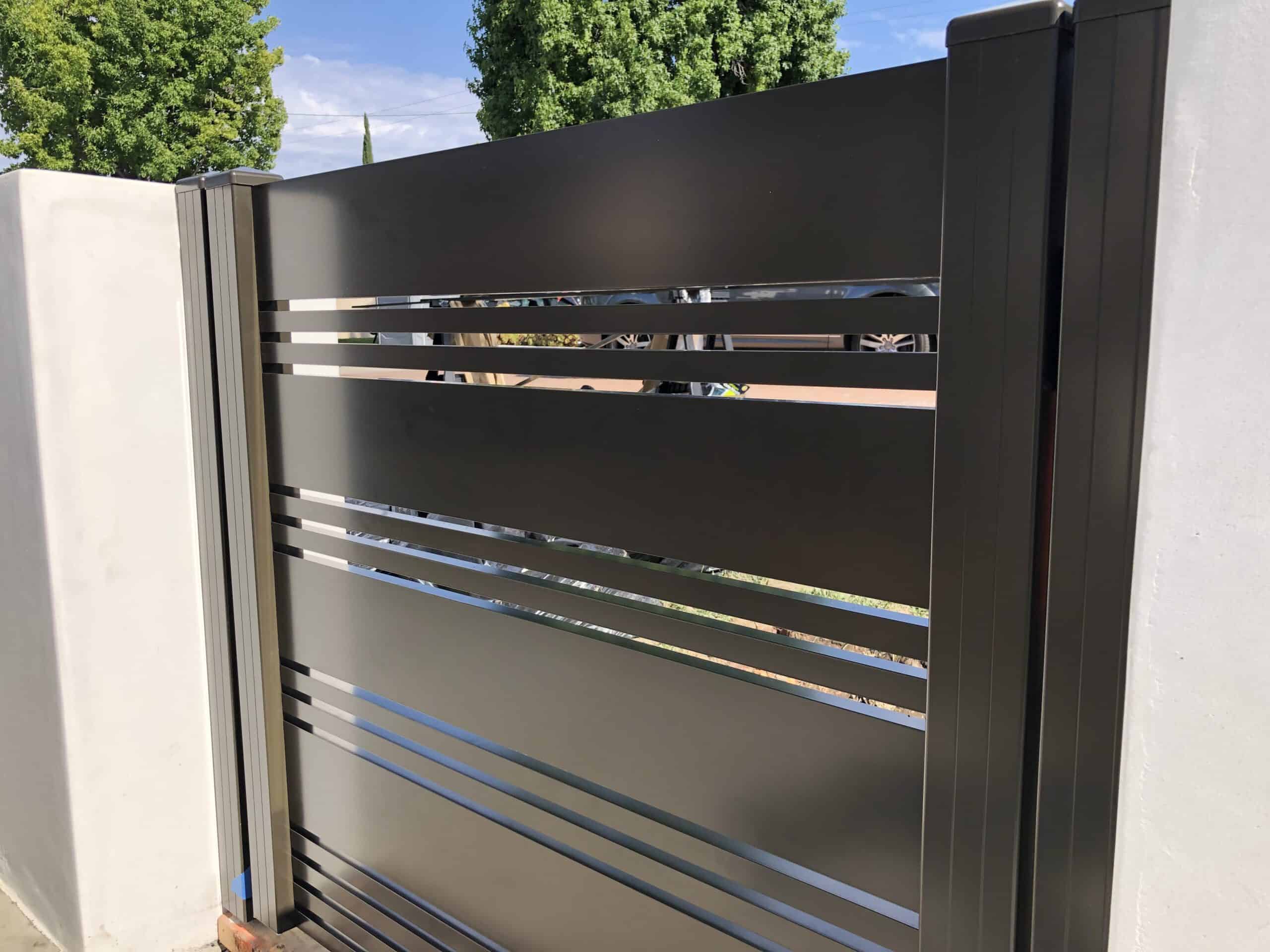 Wall top of 16” with both 5.5” and 1” aluminum slats along with .6” spacers and a 3’x4’ pedestrian gate with the same design. The color used is architectural bronze.