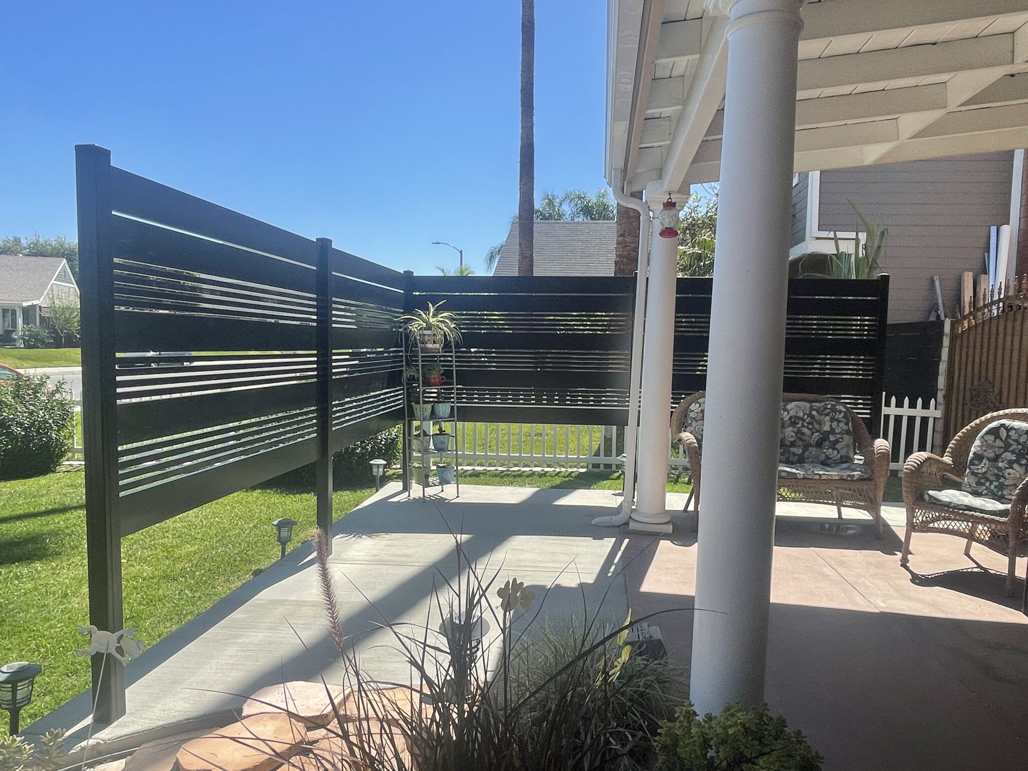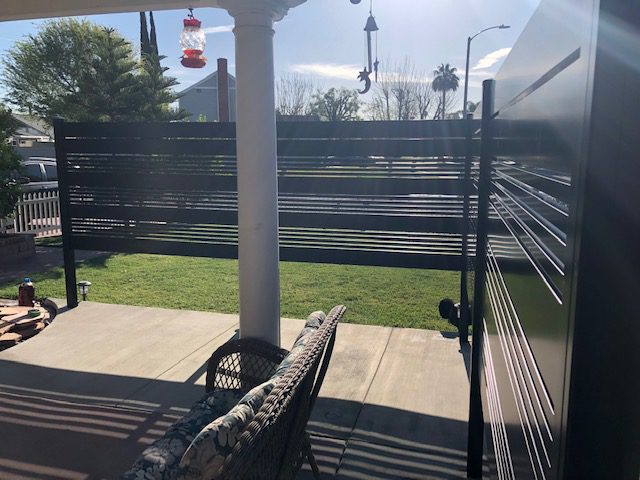 Semi-privacy patio cover in the front yard. Made for privacy from the street. Flat black Las Vegas style with 2’ gap from the floor specially made to let the small dogs run under. To build this style we used 5.5” slats with x4 1” horizontal slats as well as ½” spacers. This horizontal modern patio cover looks lift the face of the house. The fence is all aluminum made in USA and powder coated with best quality powders to give it lifetime lasting and maintenance free. A fence made of aluminum panels has been customized to fit the owner’s preferences and incorporated into an existing design.