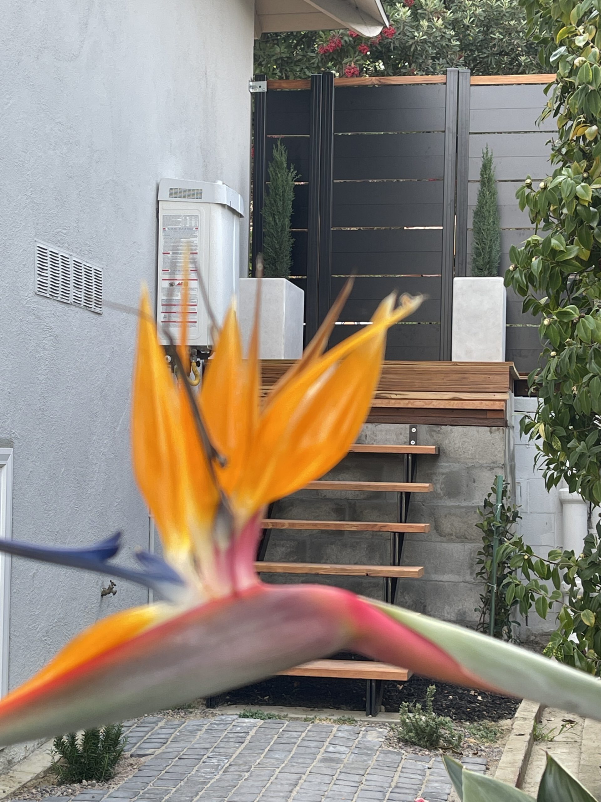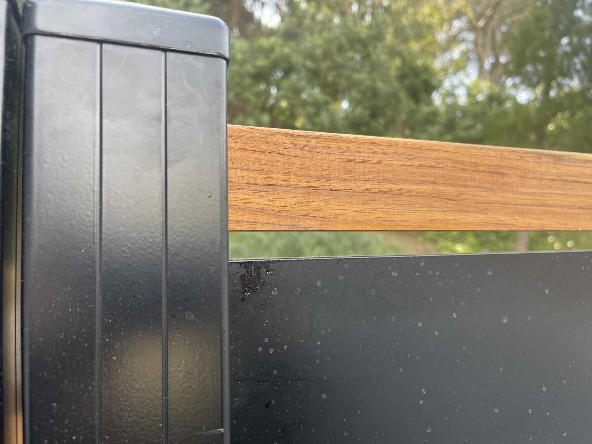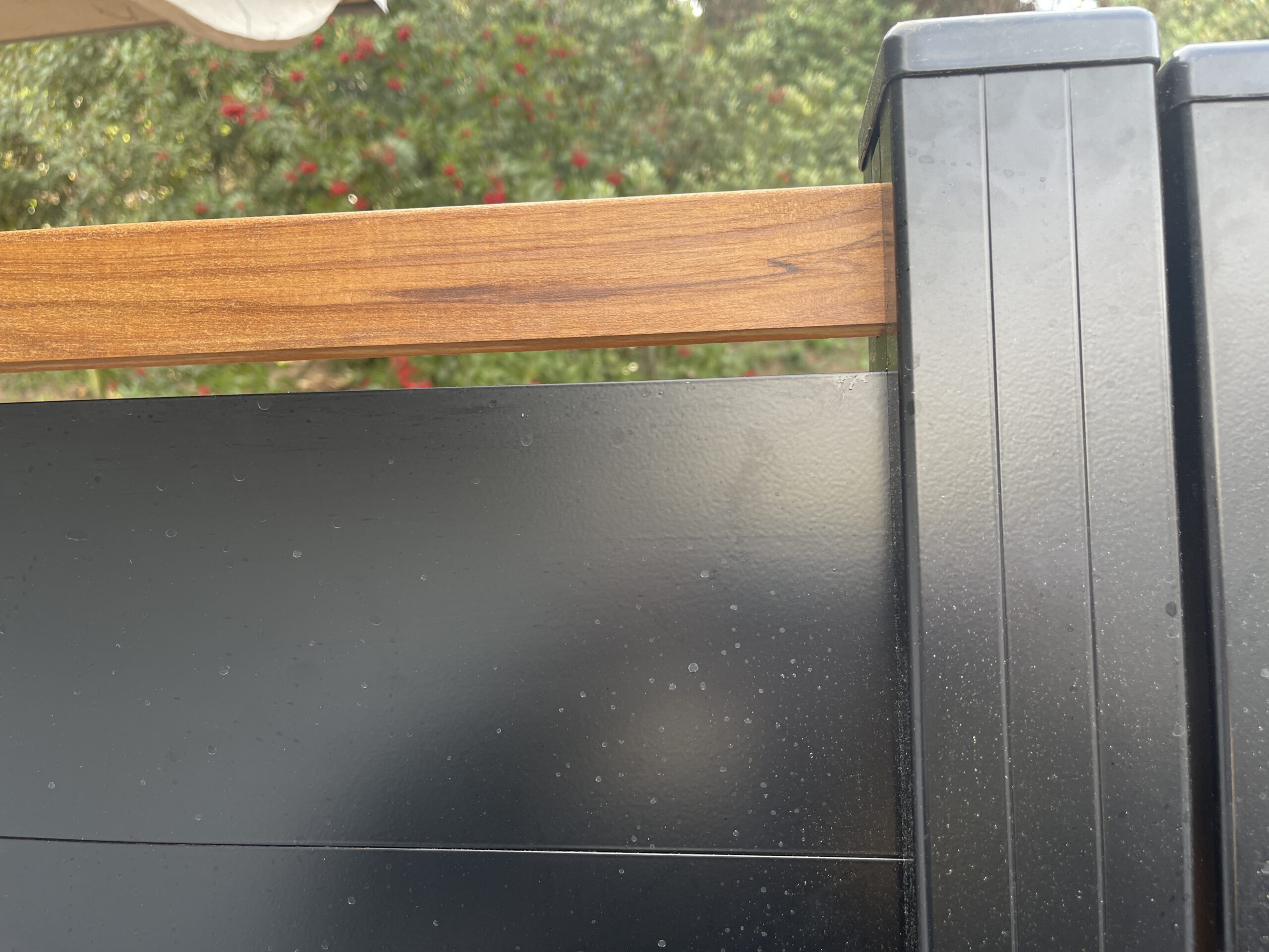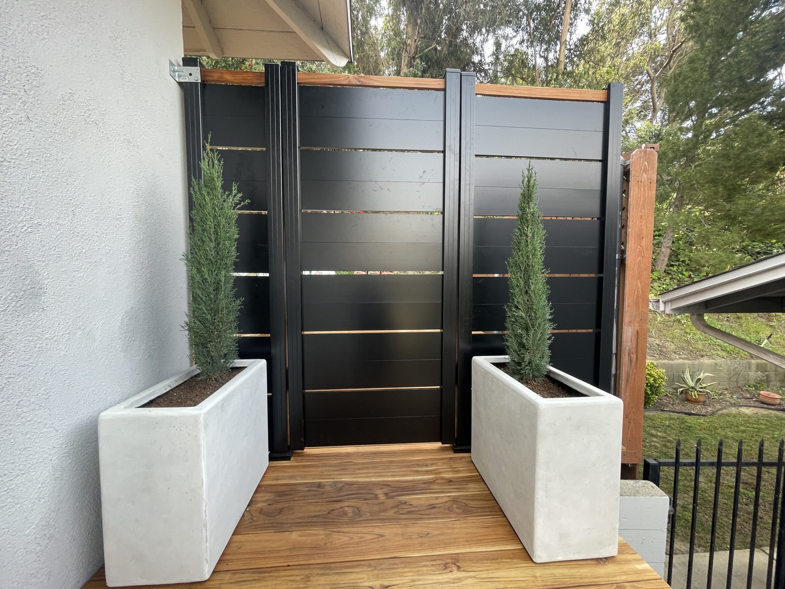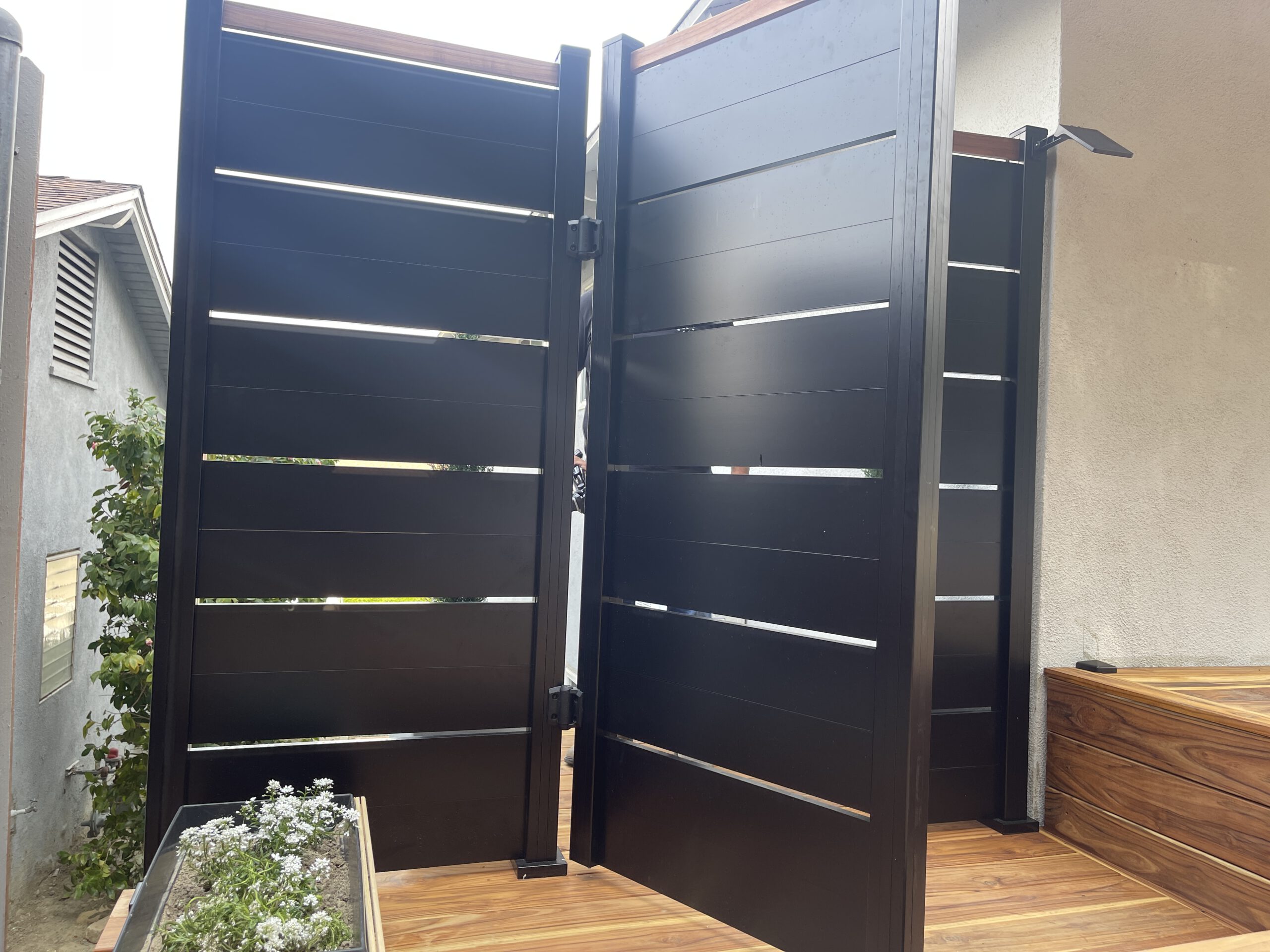DIY aluminum gate and side panel made with 5.5” slats with 1⁄2” spacer and top wood slat of 1”. Watch the video to see what Peter (the DIYer) had to say about his experience working with Alumission products to build his aluminum gate and fence panel.