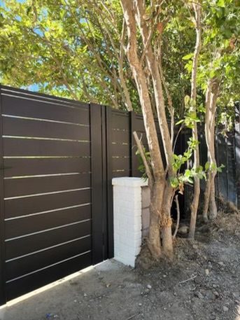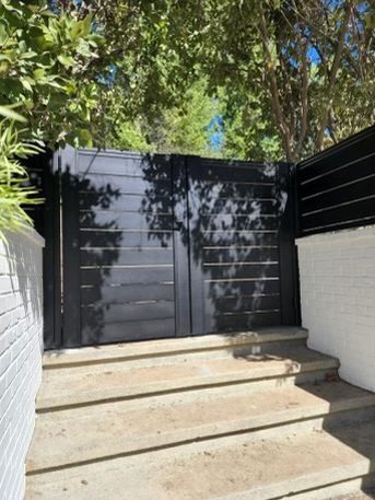 Double swing gates between 3′ height block wall. Flat black powder coated aluminum Los Angeles style with two 1″ slats on top.