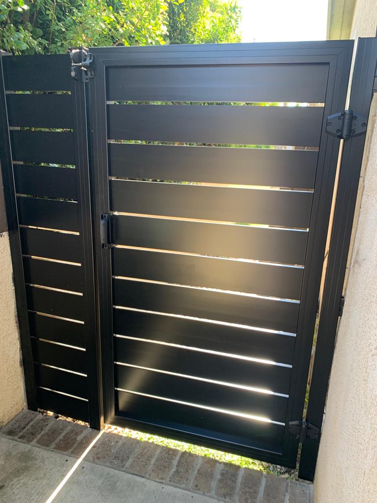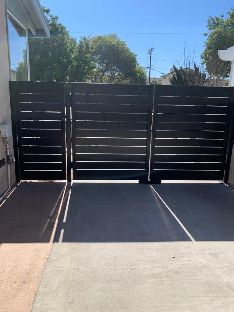 Aluminum gates for side yards. One of them is double swing gates for cars with a side aluminum pedestrian gate. The other side is a standard 3.5’ aluminum side yard gate. All made with flat black 5.5” slats with ½” spacers. When properly installed and maintained, aluminum gates generally last at least twenty years. Aluminum does not warp, crack, or shrink under any weather conditions.