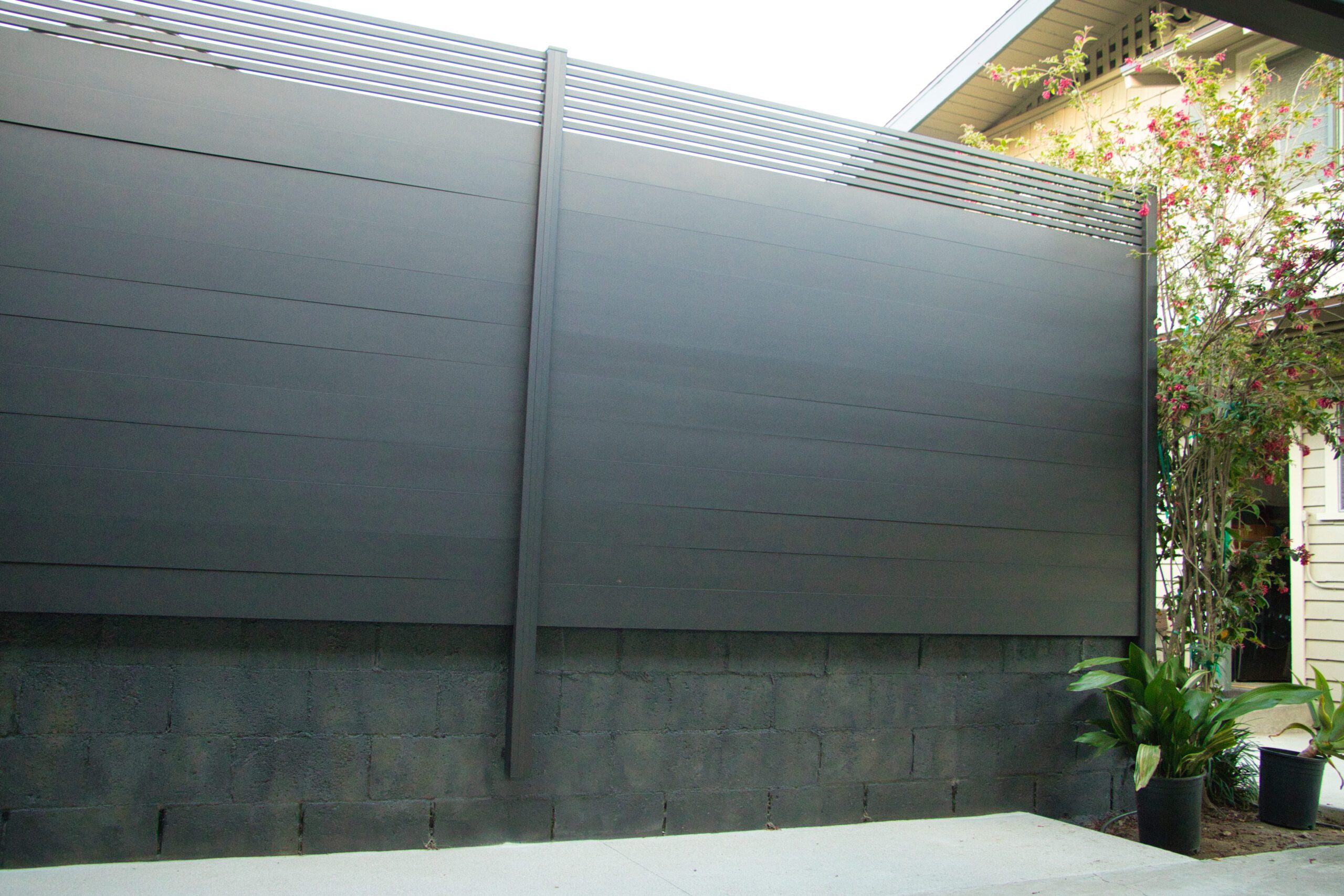 Mixing styles to create custom designs. Our Dallas style features 5.5-inch slats divided by 0.5-inch spacers crafted from premium aluminum for durability and a modern aesthetic. Additionally, this design is decorated with a built in topper that features 1-inch slats divided by 0.5-inch spacers. To further this design, the panels used the New York style configuration which offers full privacy coverage with no spacers.