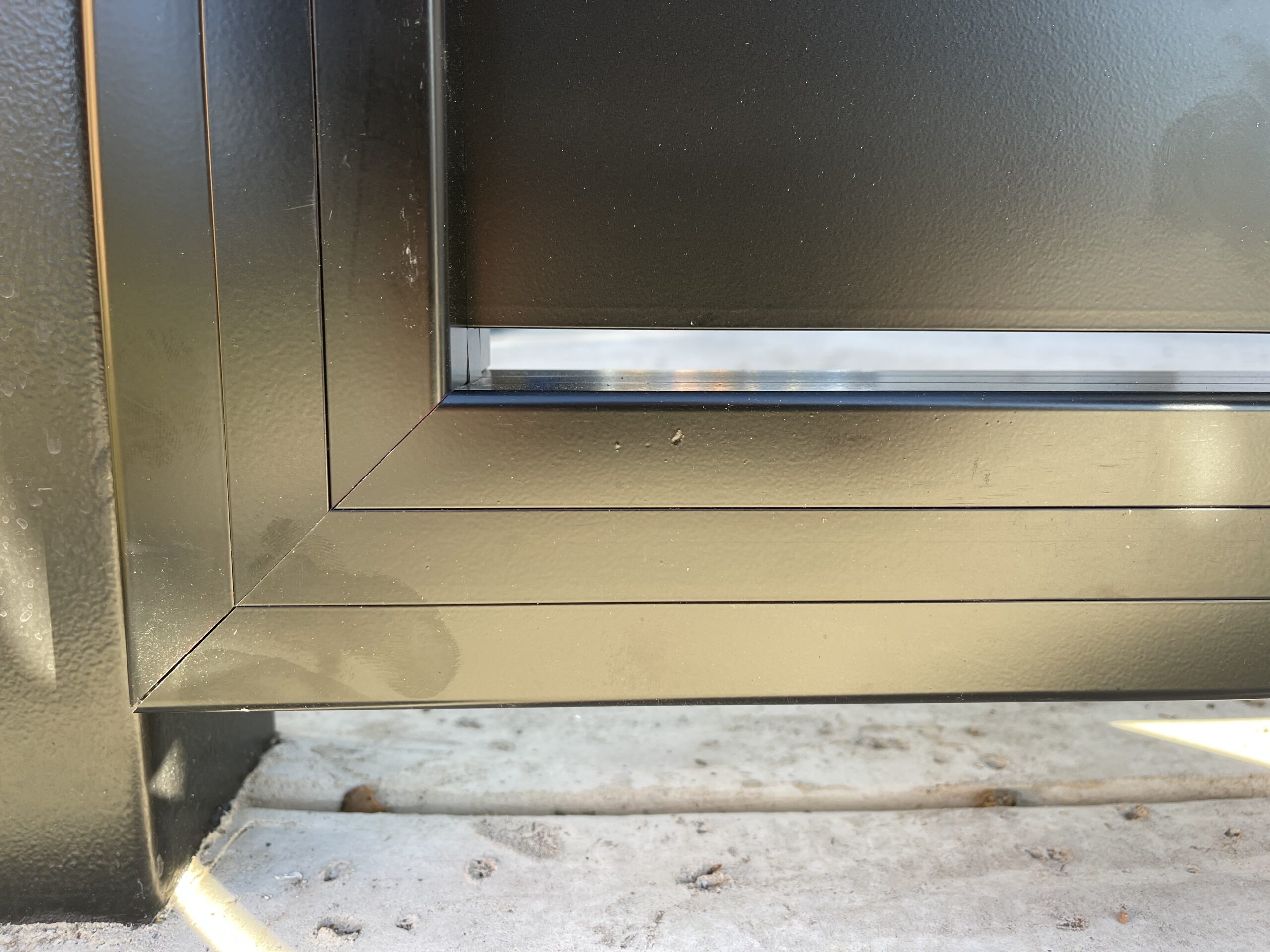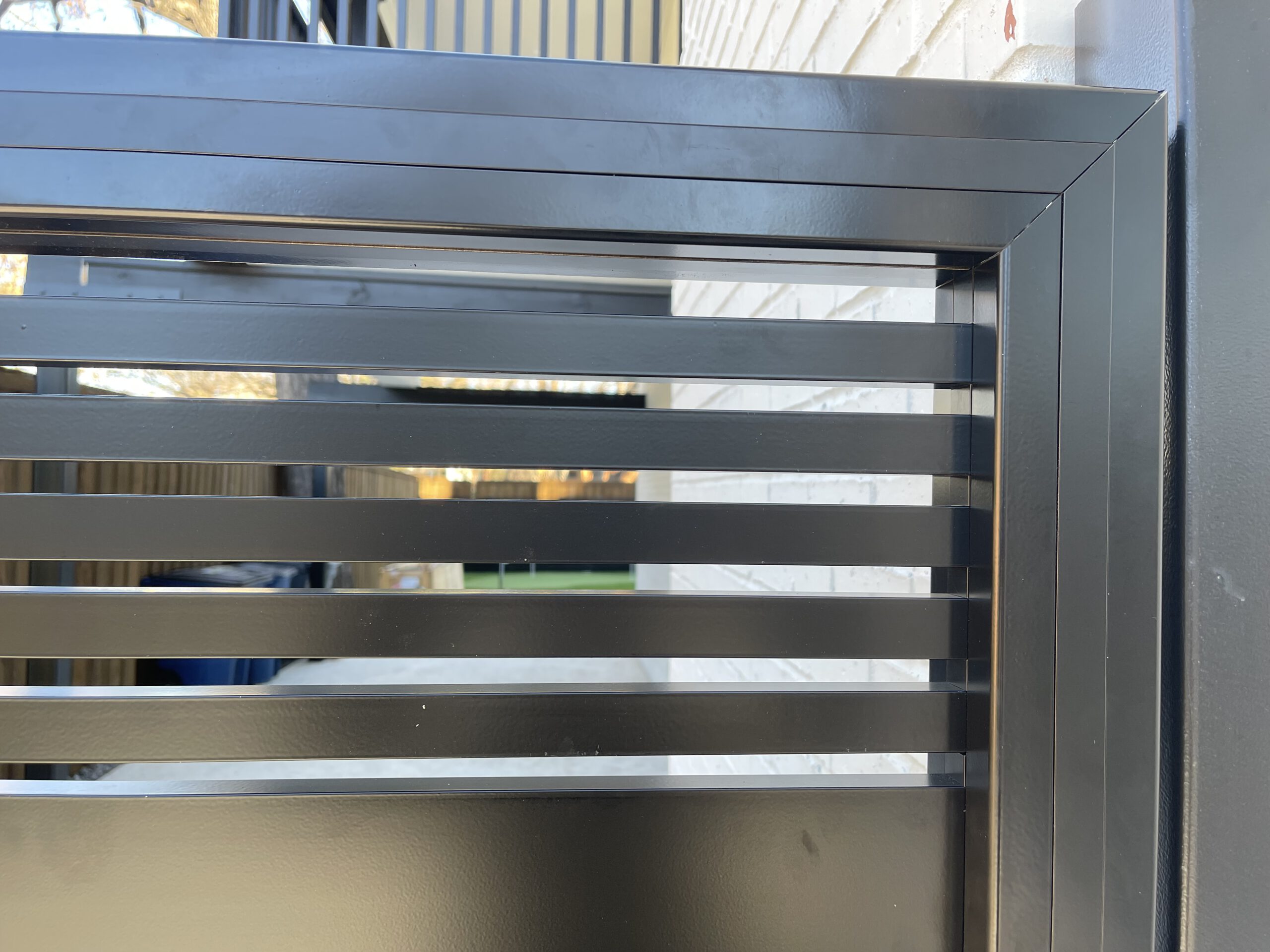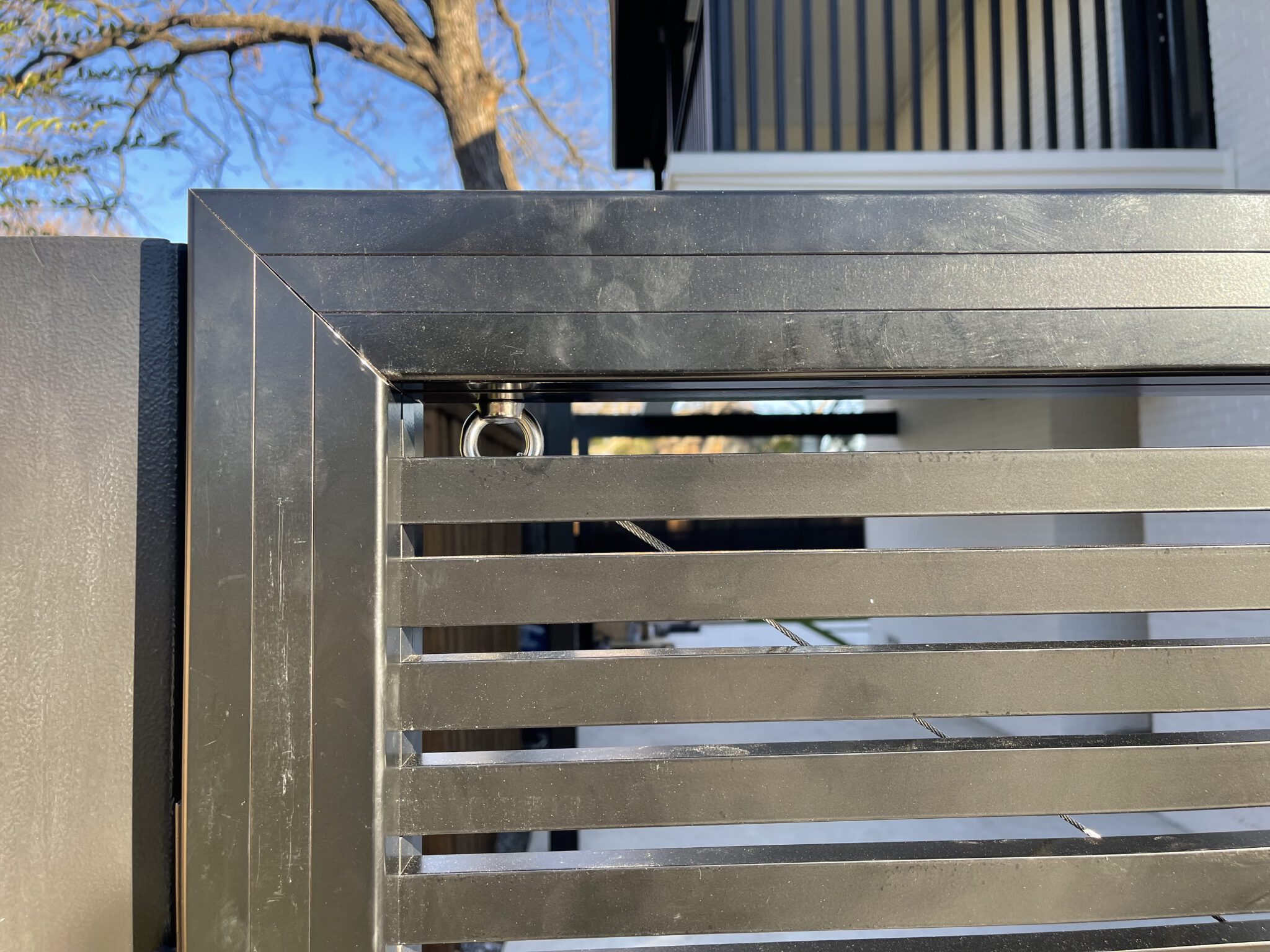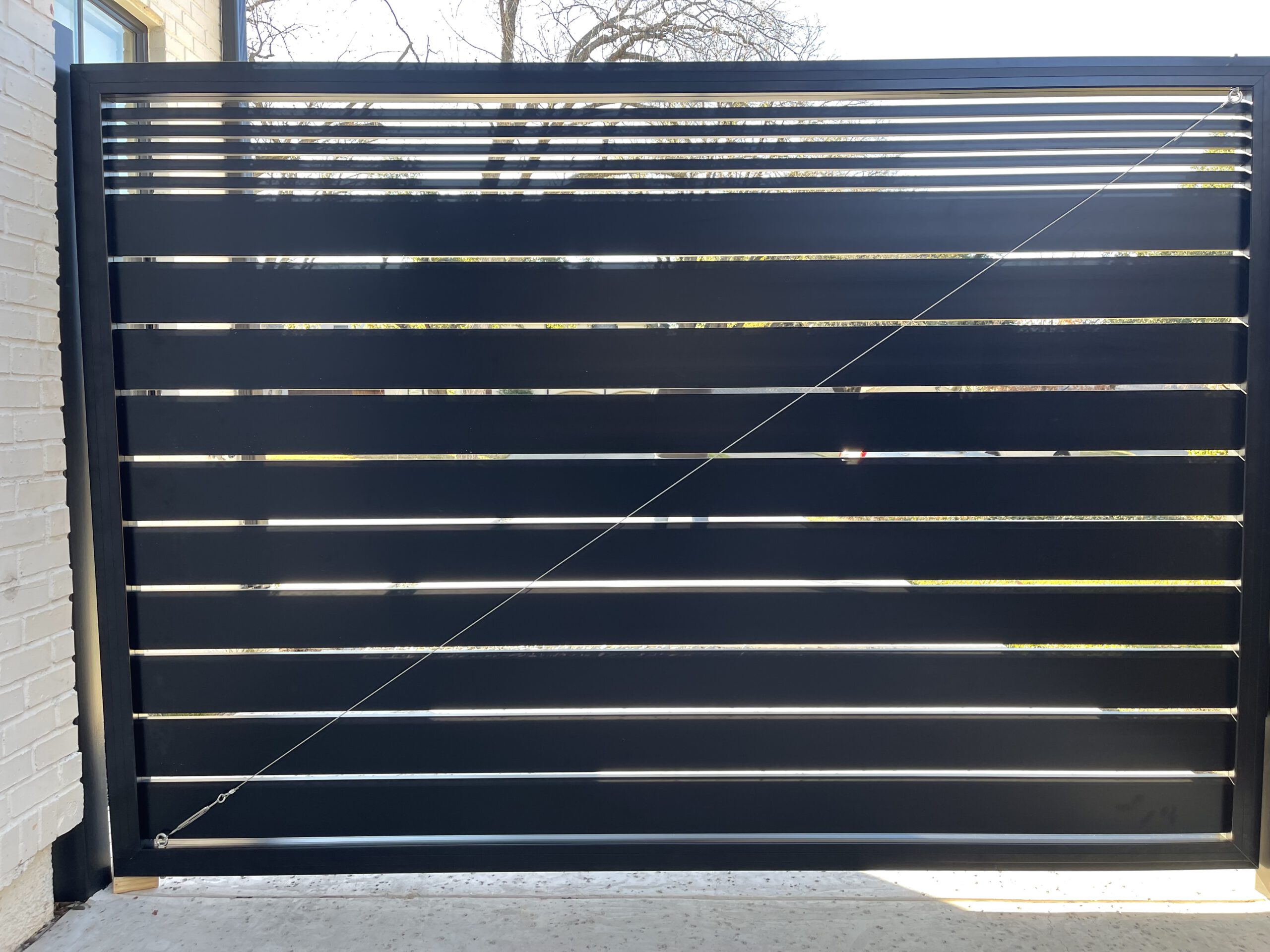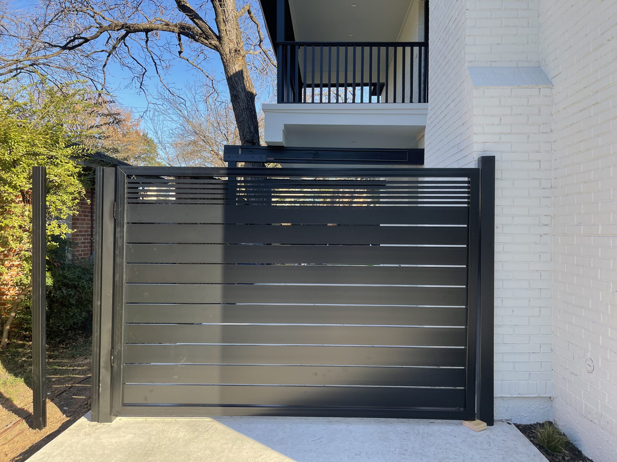 10’ long aluminum swing gate at 7’ height made from 5.5” slats on the first 6’ and 1” slats on the top 12”. The aluminum gate is fully framed with 45-degree cuts. LiftMaster LA400 was installed to motorized this gate.