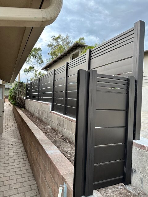 Black aluminum fence in Ventura, CA 93003 offers a contemporary solution for those seeking both privacy and aesthetic appeal. This modern aluminum fence features horizontal slats painted black, complemented by vertical posts, achieving a minimalistic and sleek design. Perfectly integrated into the structure is a pedestrian gate, seamlessly blending utility with style. Positioned atop a low concrete wall, this fence rises to a practical height, ensuring privacy while still being a testament to modern design standards typical of high-end installations. Whether you’re a homeowner, property manager, or business owner in Ventura, this fence is a prime example of providing security and elegance for any property. Emphasizing modernity and sophistication, the fence’s design truly encapsulates the essence of Ventura’s stylish yet laid-back lifestyle.