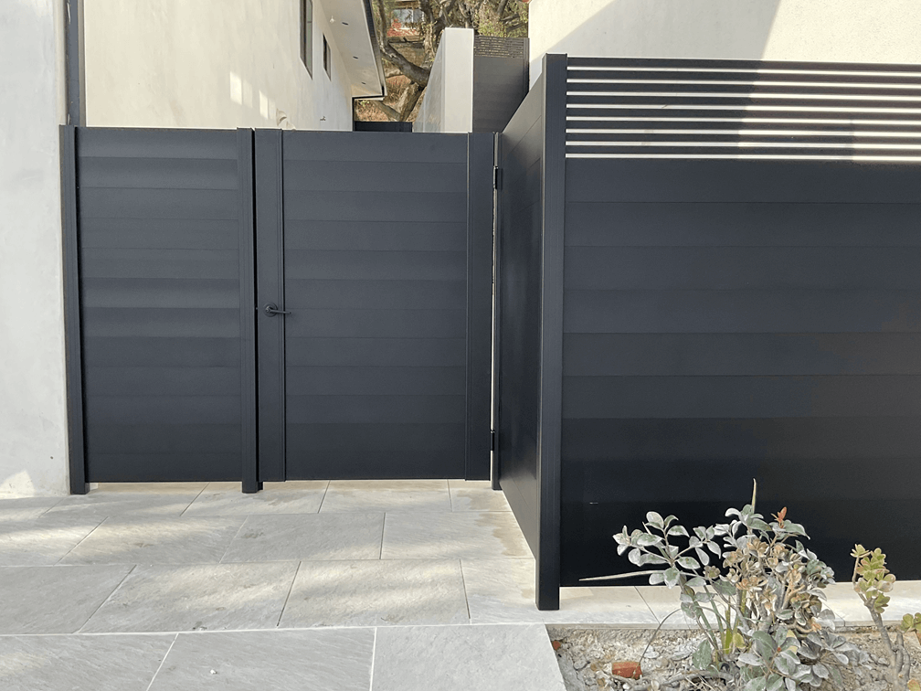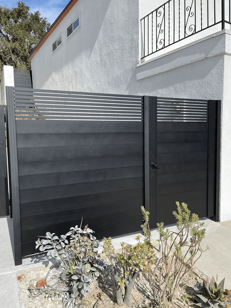 Matte black aluminum gate with horizontal slats, installed in a modern landscape.