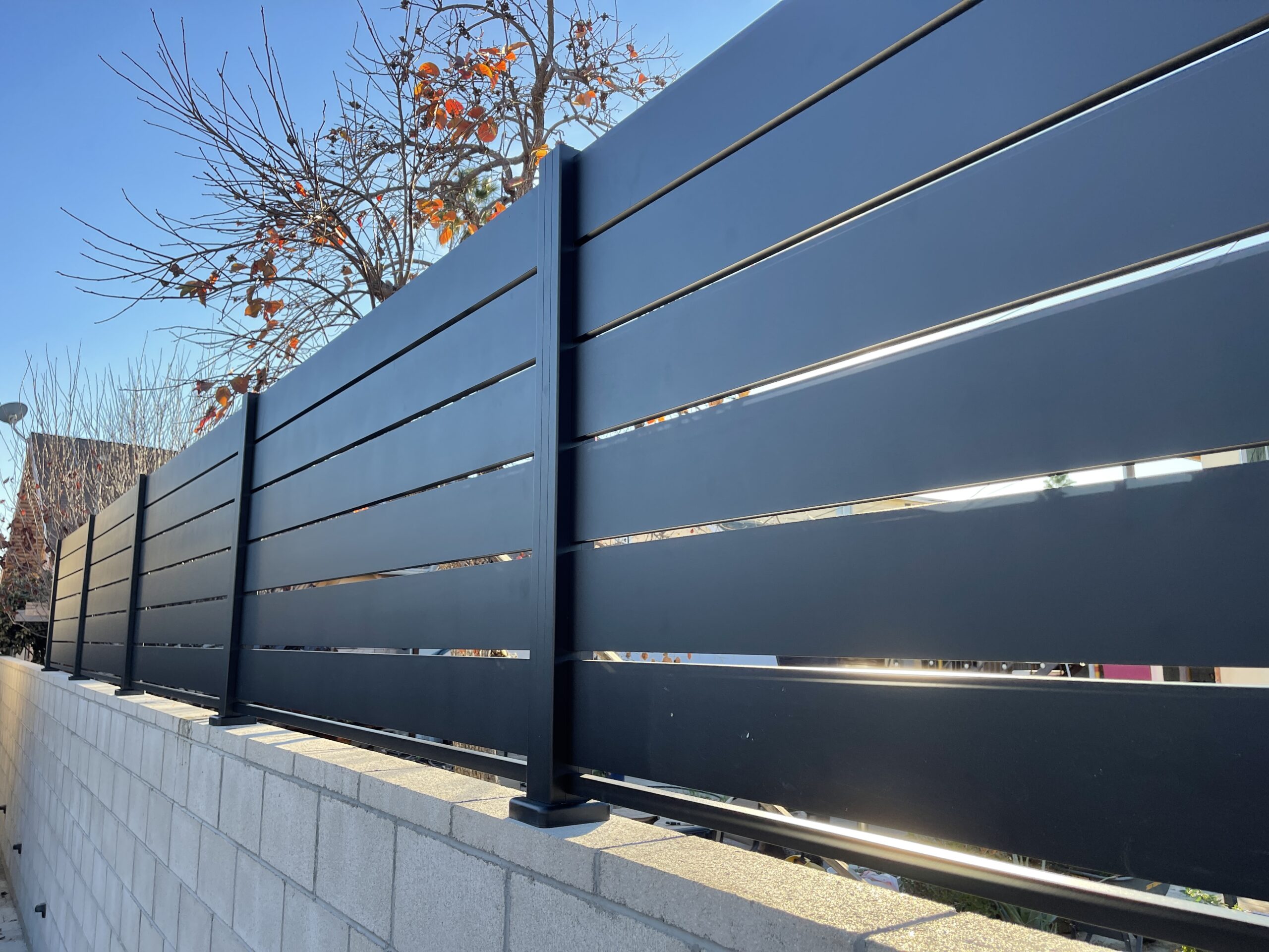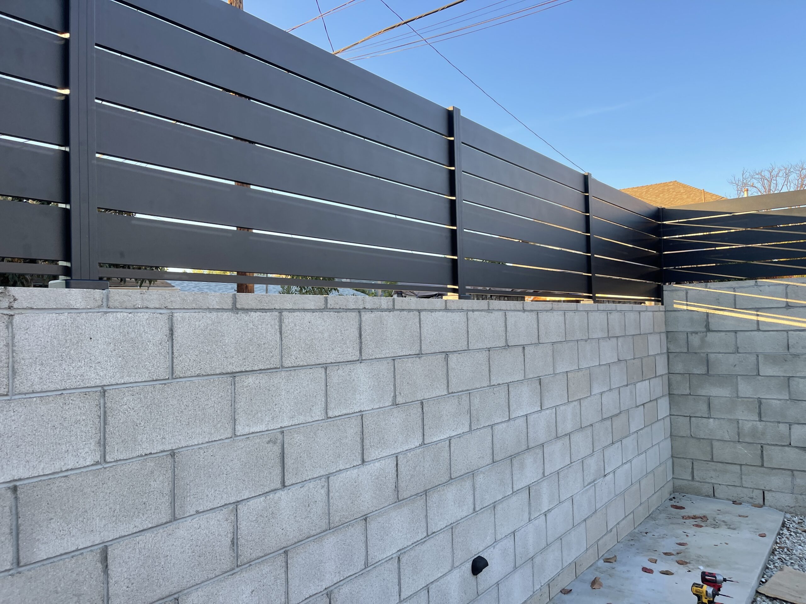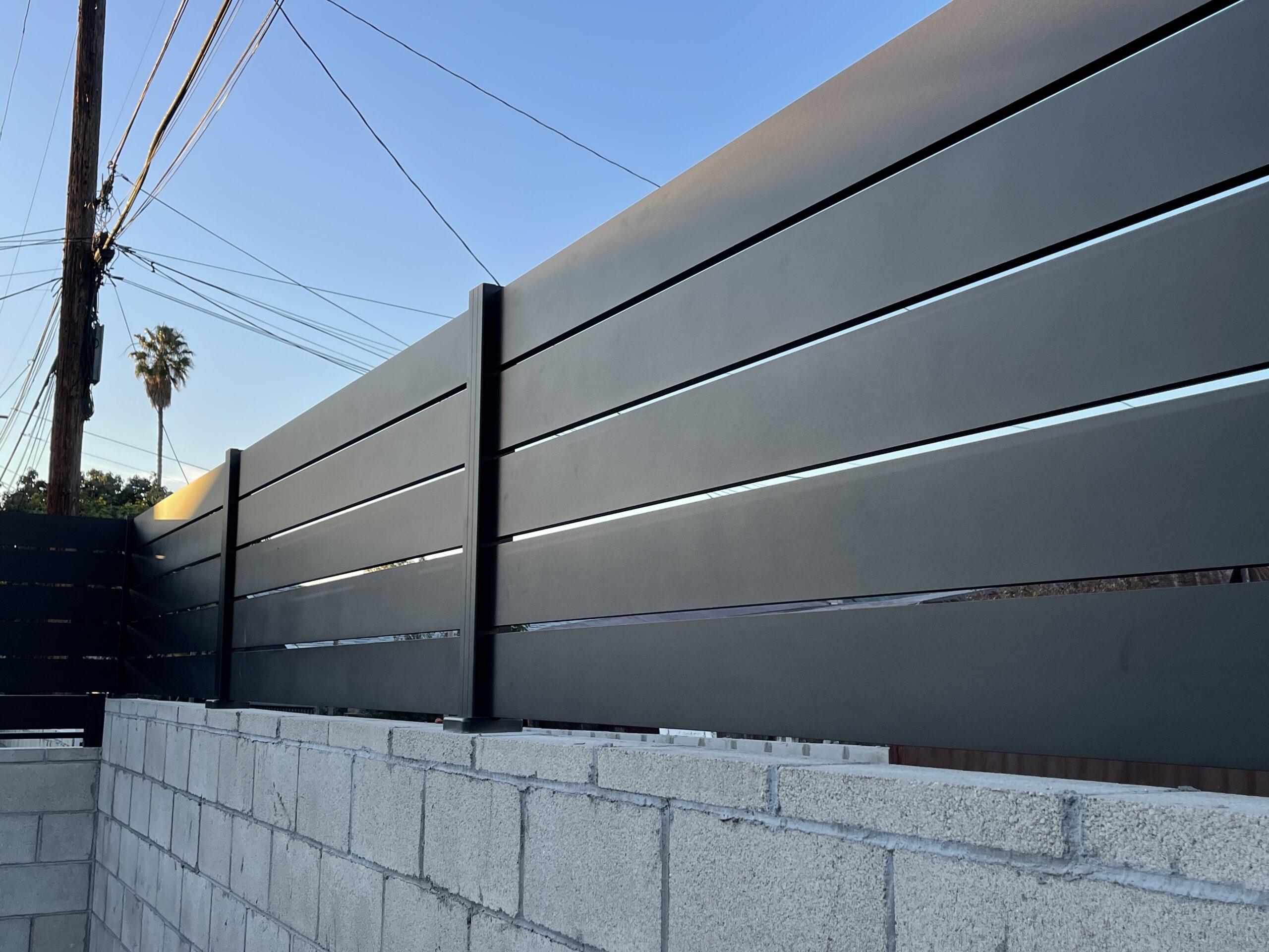 Black Los Angeles style wall topper built from 5.5″ aluminum slats ans 1/2″ spacers.