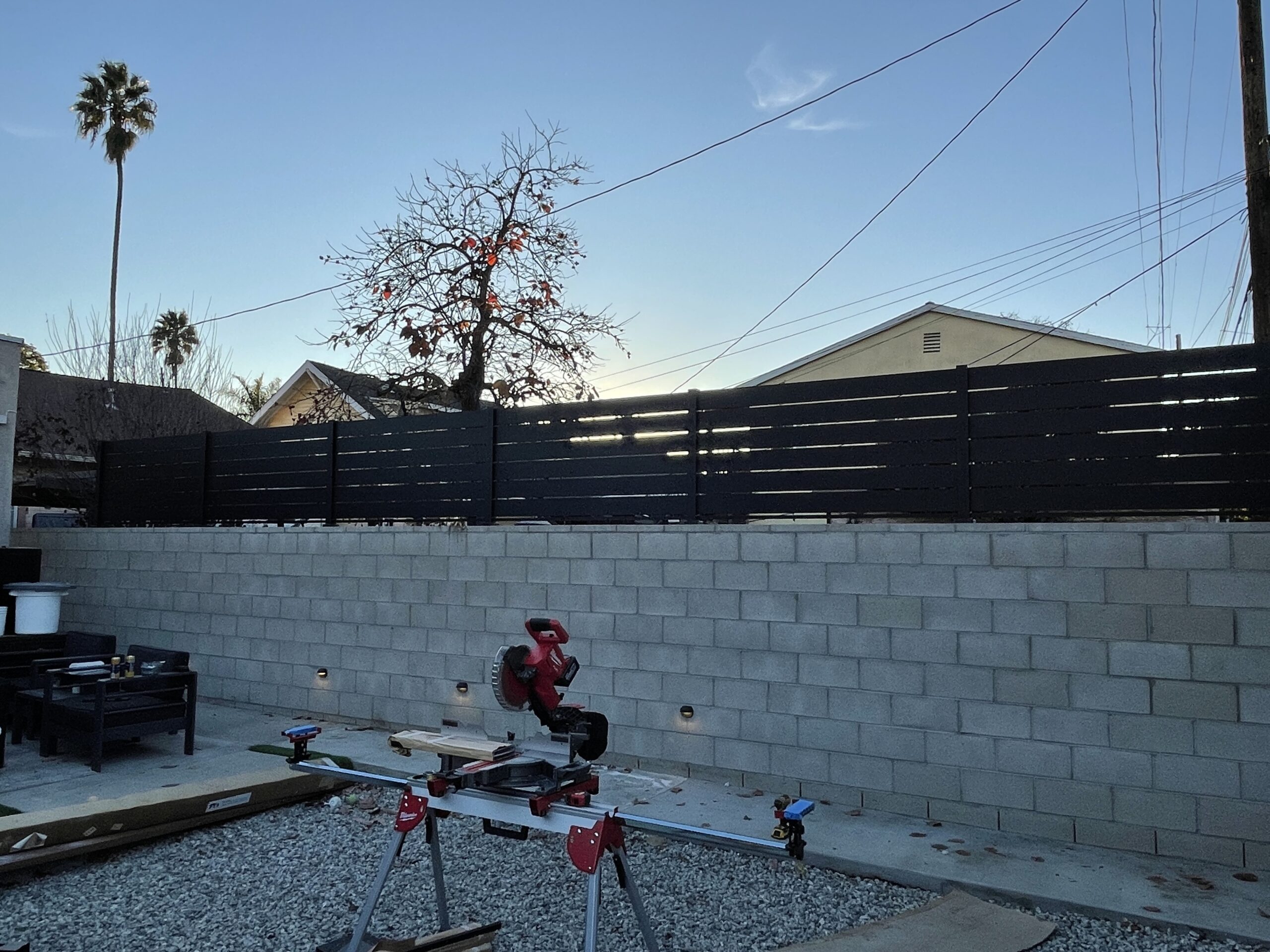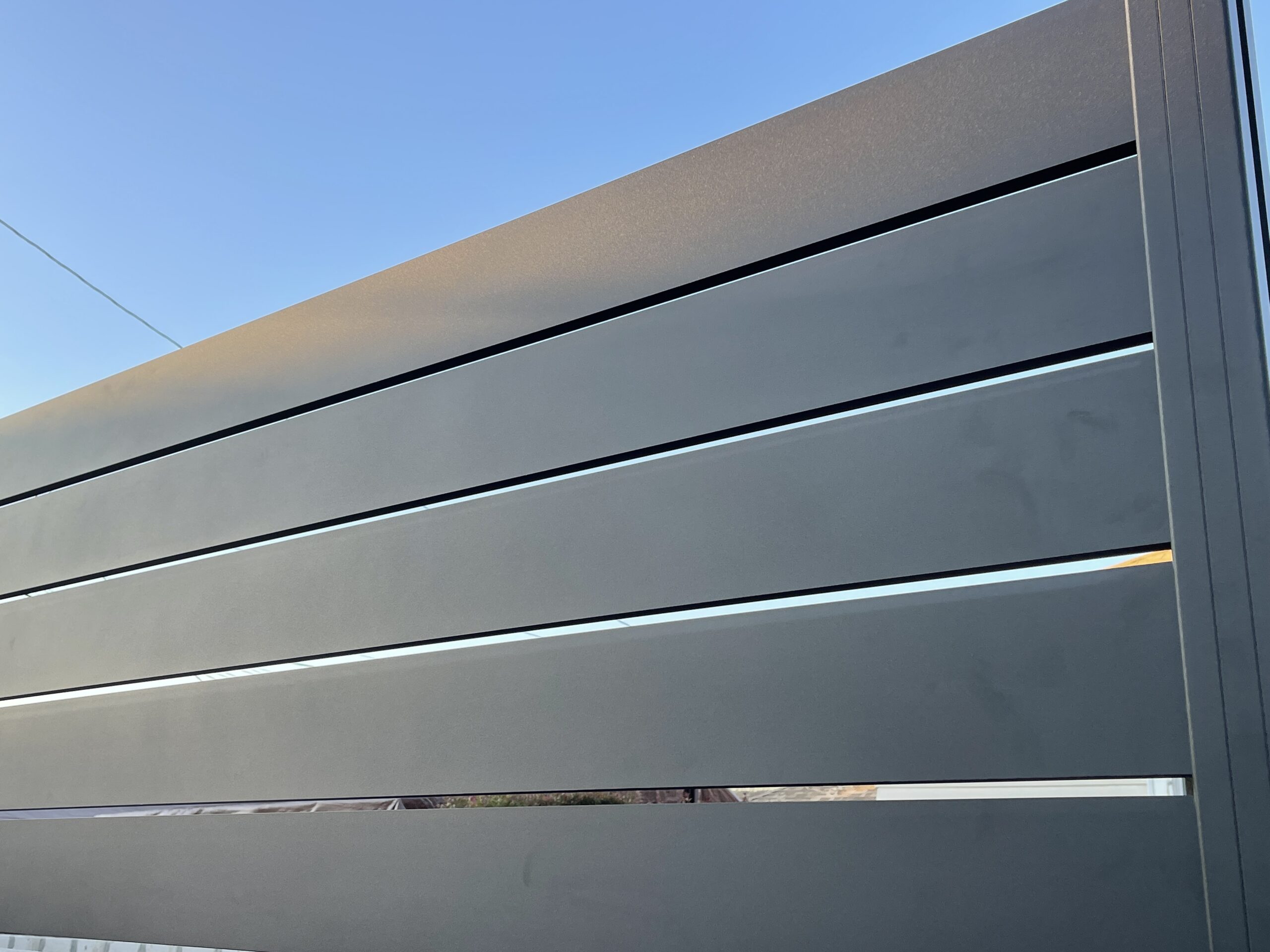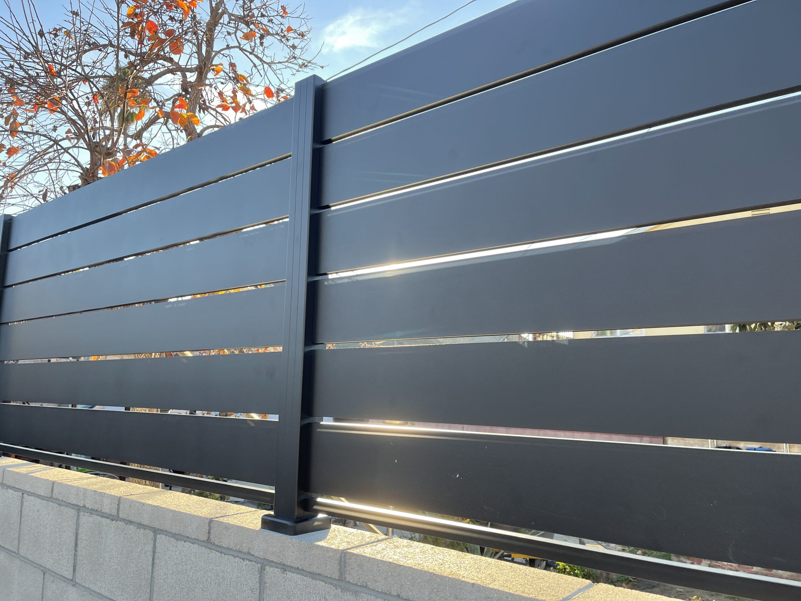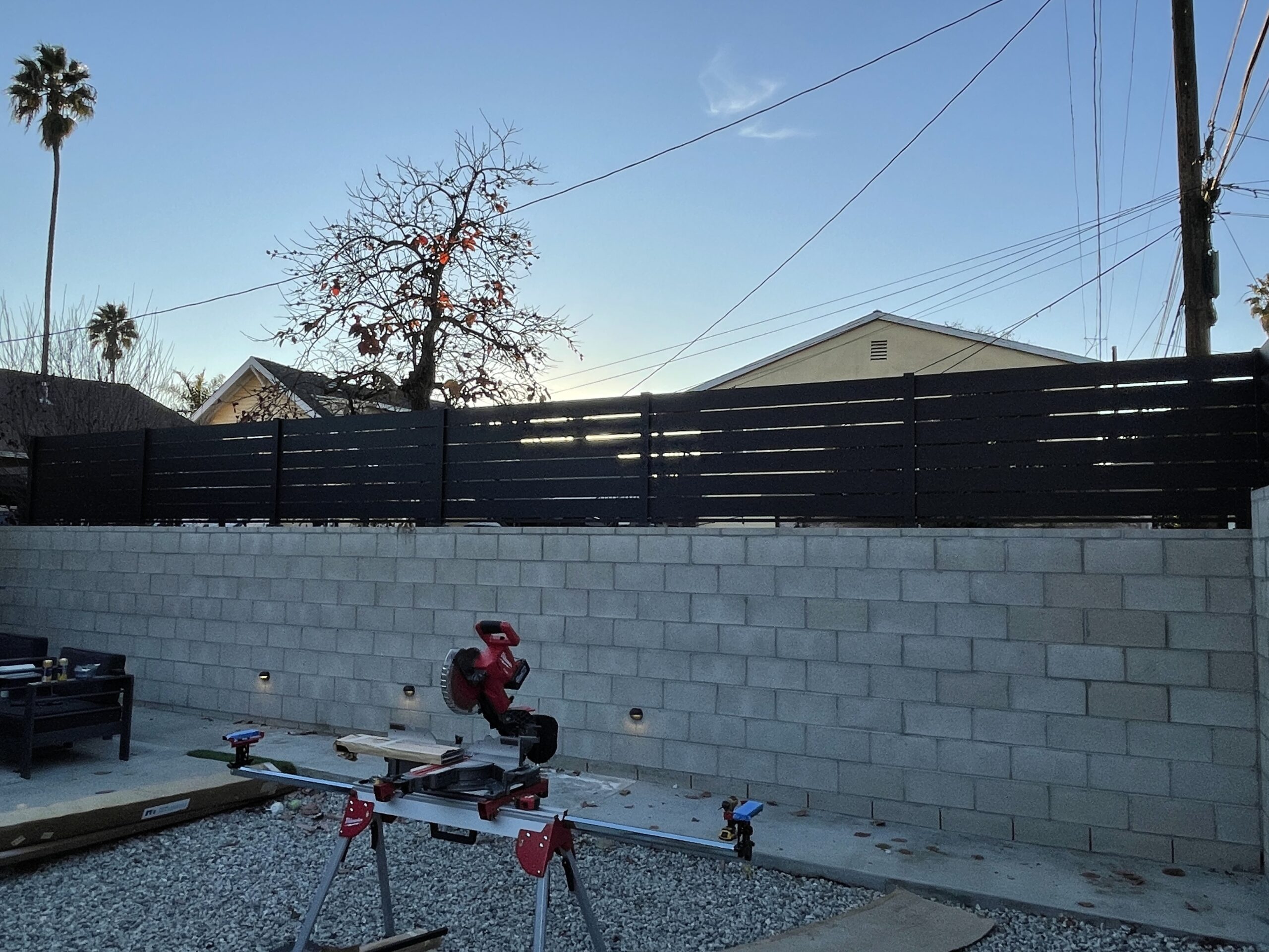 Black Los Angeles style wall topper built from 5.5″ aluminum slats ans 1/2″ spacers.