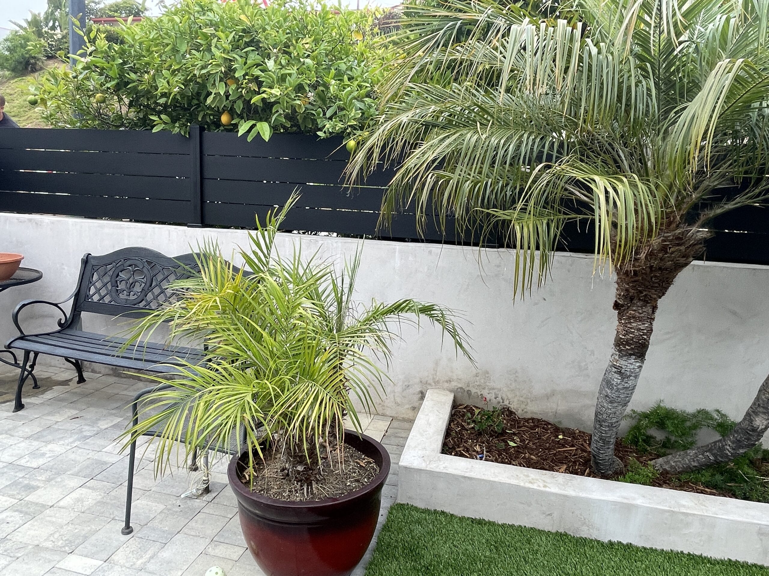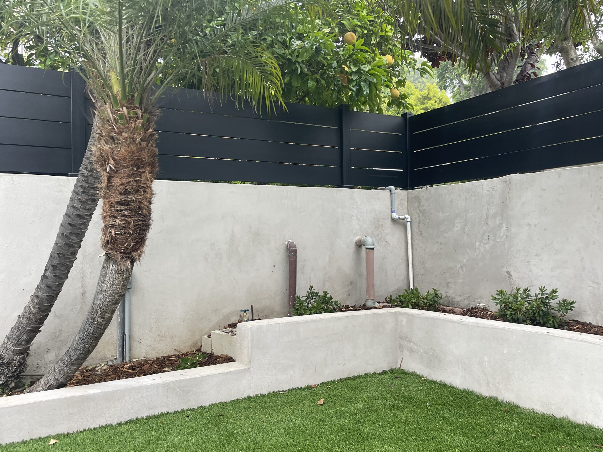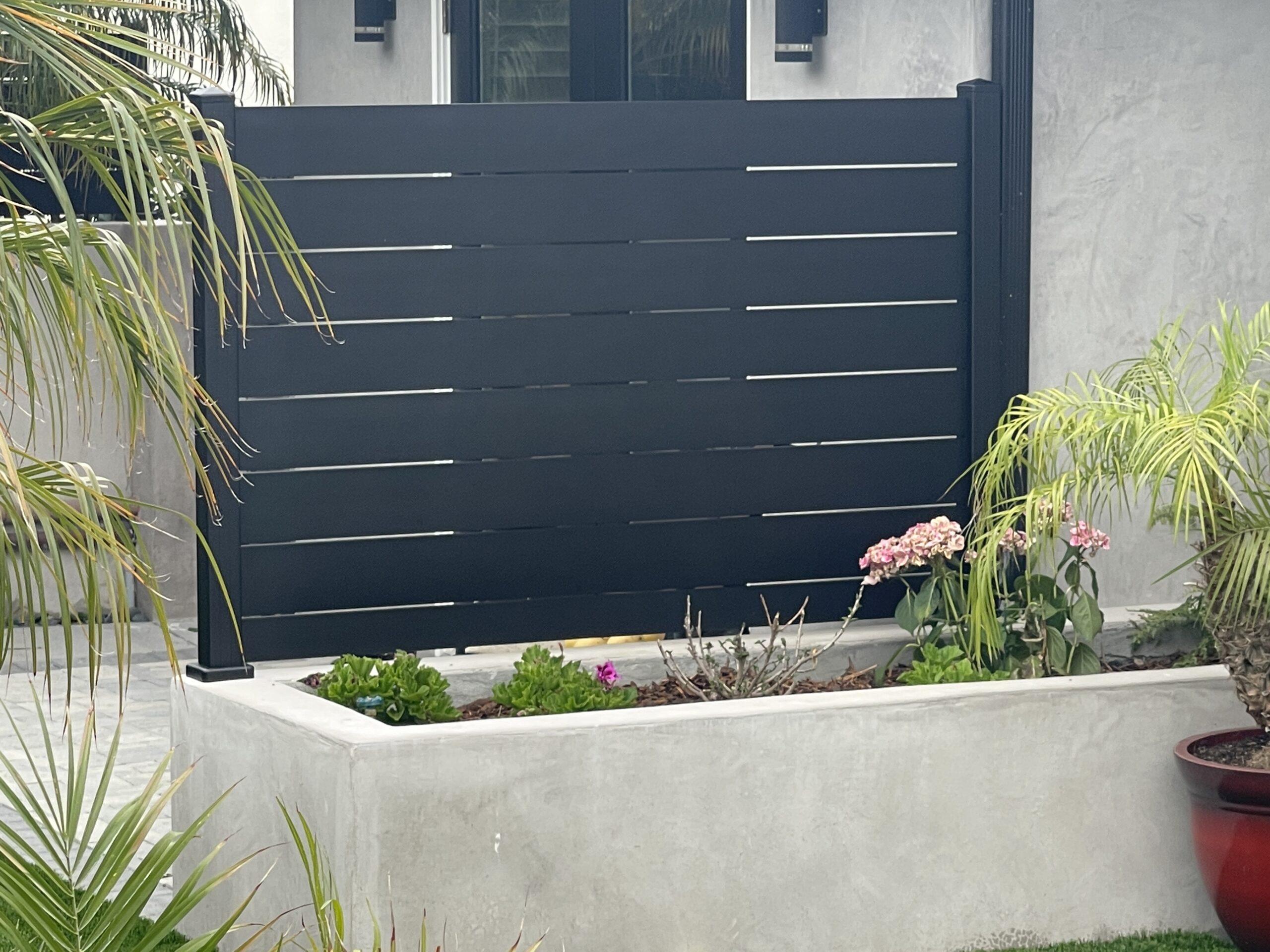 Black aluminum wall topper and small privacy fence panel. This installation was made with our 5.5″ aluminum slats and 1/4″ spacers for extra privacy.