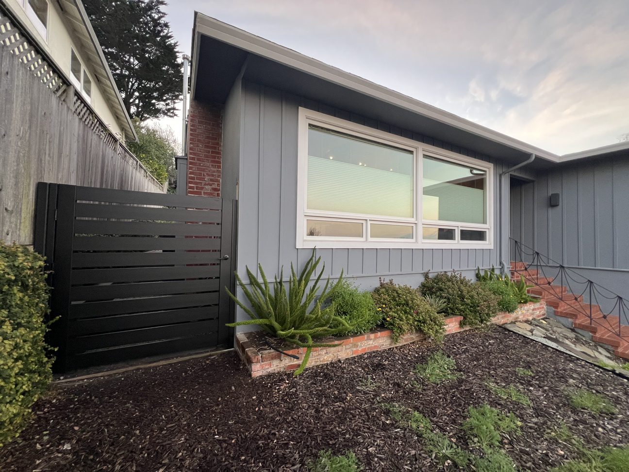 Our Black LA Style pedestrian gate installed in Bay Area, CA, offers a unique blend of modern design and exceptional durability. Designed with sleek, horizontal aluminum slats finished in a refined dark black, this gate seamlessly integrates with contemporary residential aesthetics. Positioned to the right of a concrete driveway leading to a garage, the gate provides both an elegant look and enhanced security. Aluminum gates are a wise choice for homeowners in the Bay Area due to their resistance to rust and corrosion, even in the variable coastal climate. The powder-coated finish ensures a long-lasting, maintenance-free experience, perfect for those who value both style and practicality. This Los Angeles-style gate not only complements the light-colored environment with its striking appearance but also provides privacy and functionality. Installations like these by Access Masters highlight the potential for elegant, custom-tailored solutions in any residential setting.