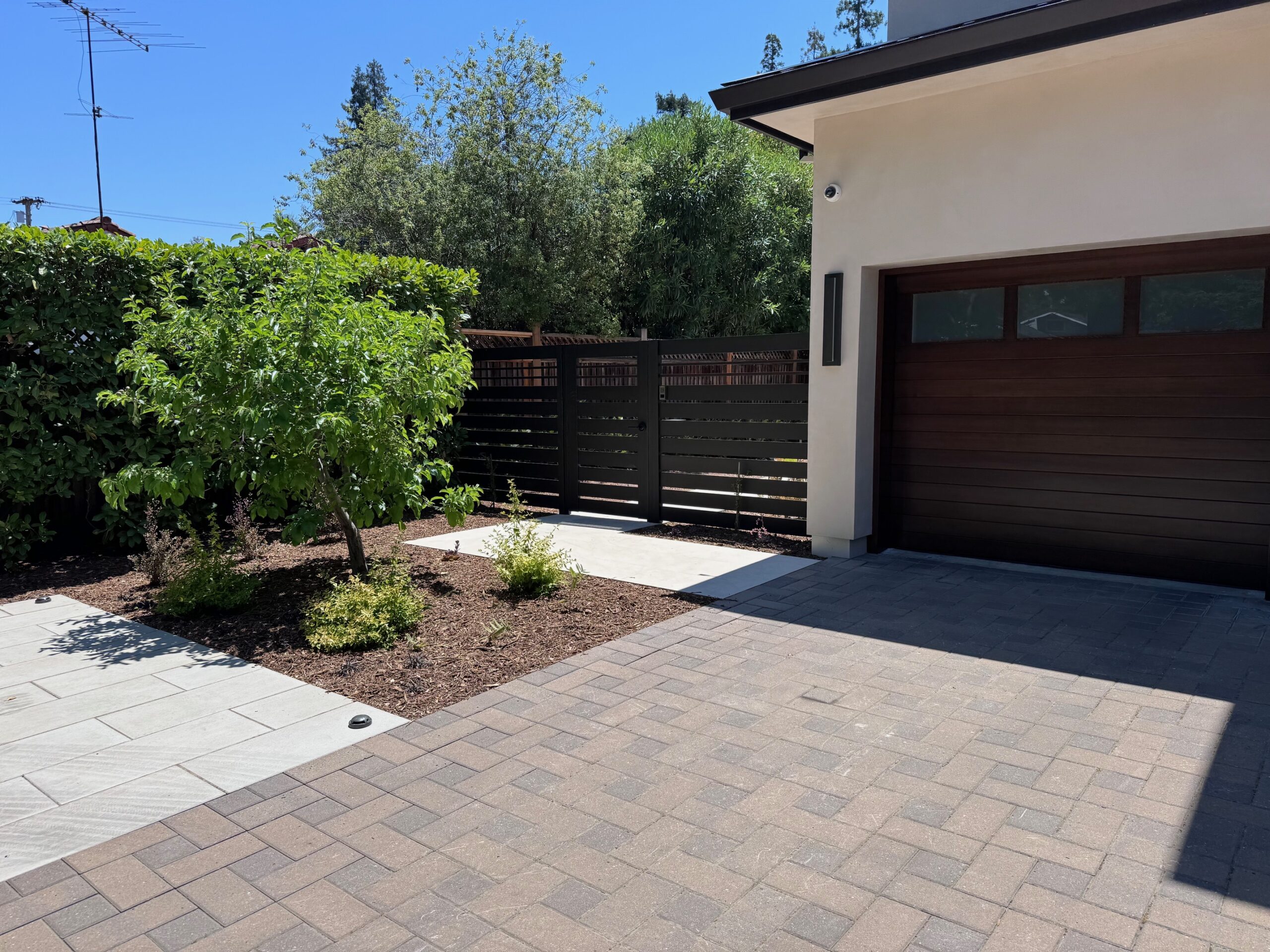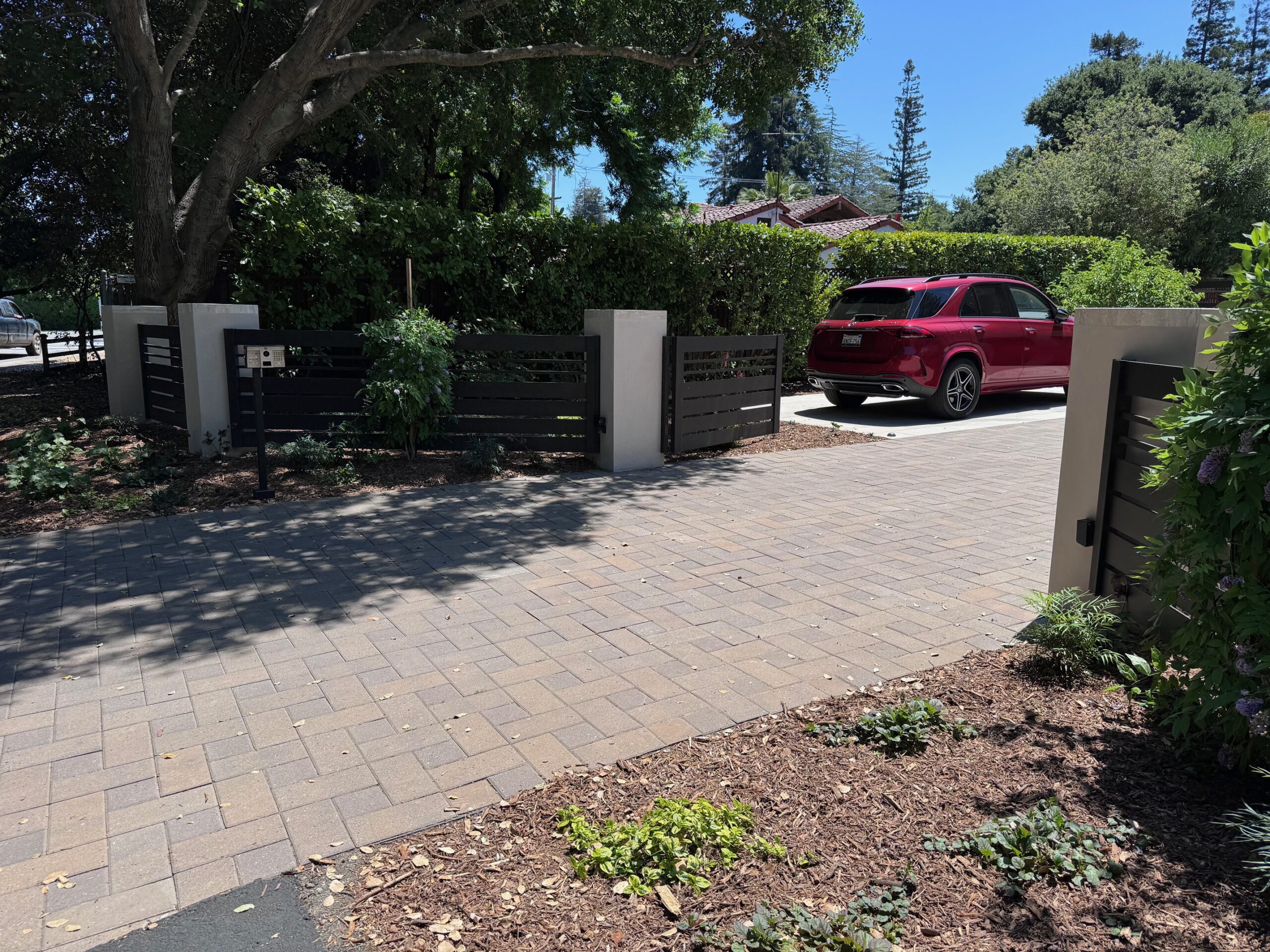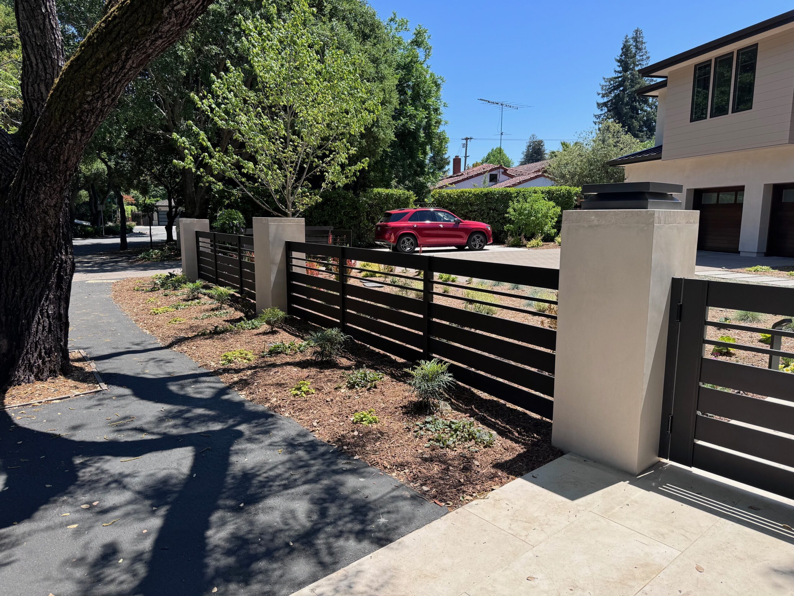 Alumission proudly presents our bronze fence and gates located in Menlo Park, CA 94025. These modern pedestrian gates are crafted from powder-coated aluminum and feature sleek horizontal slats, meticulously painted in a sophisticated bronze color. The gates seamlessly blend within a garden setting, bordered by a wooden fence and surrounded by lush greenery, enhancing both security and visual appeal.