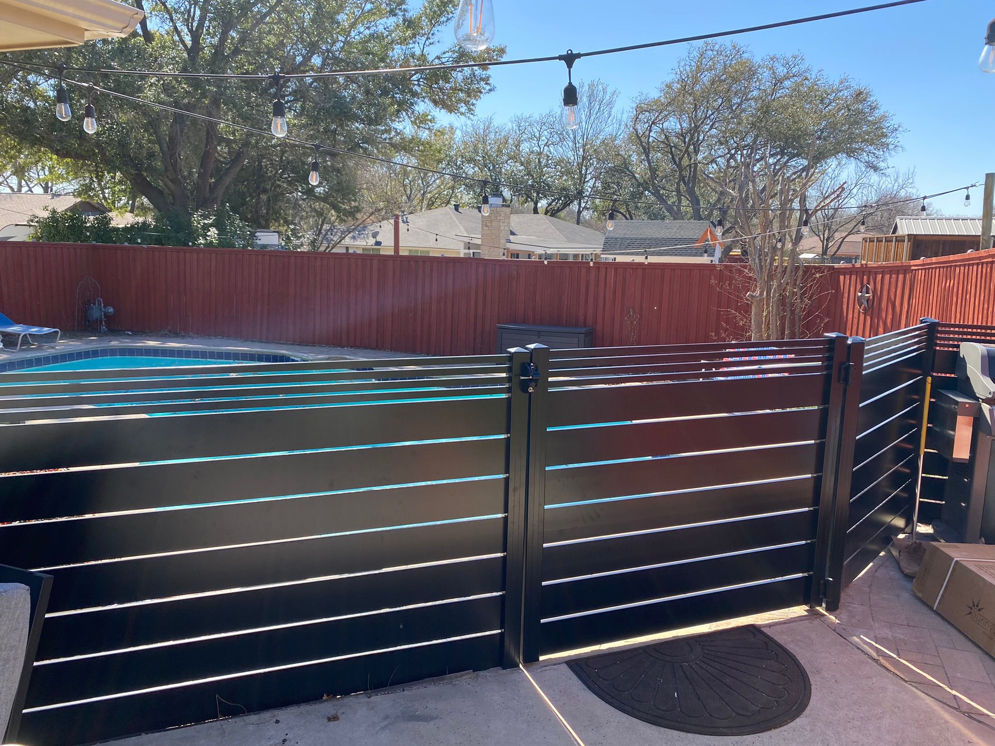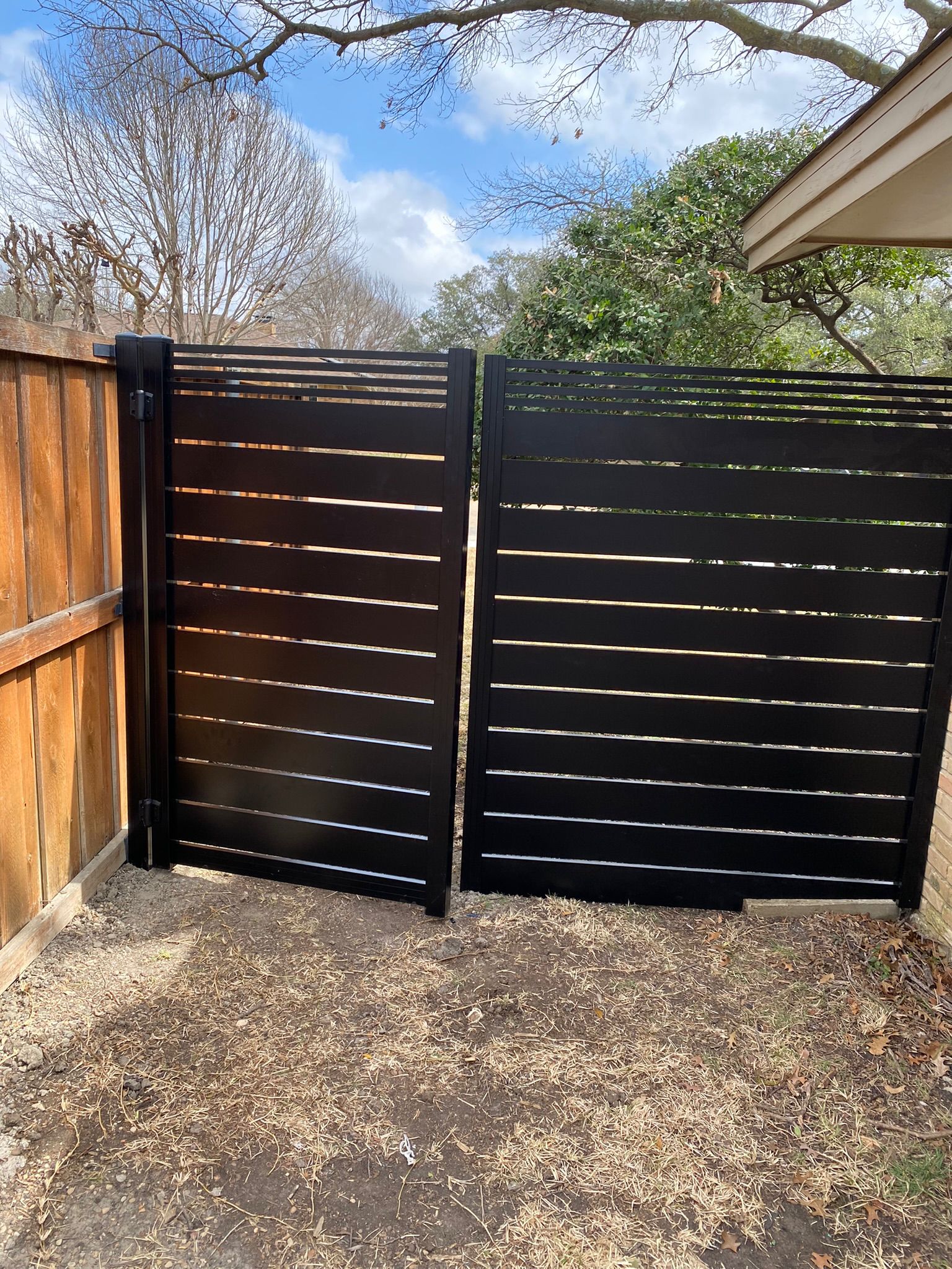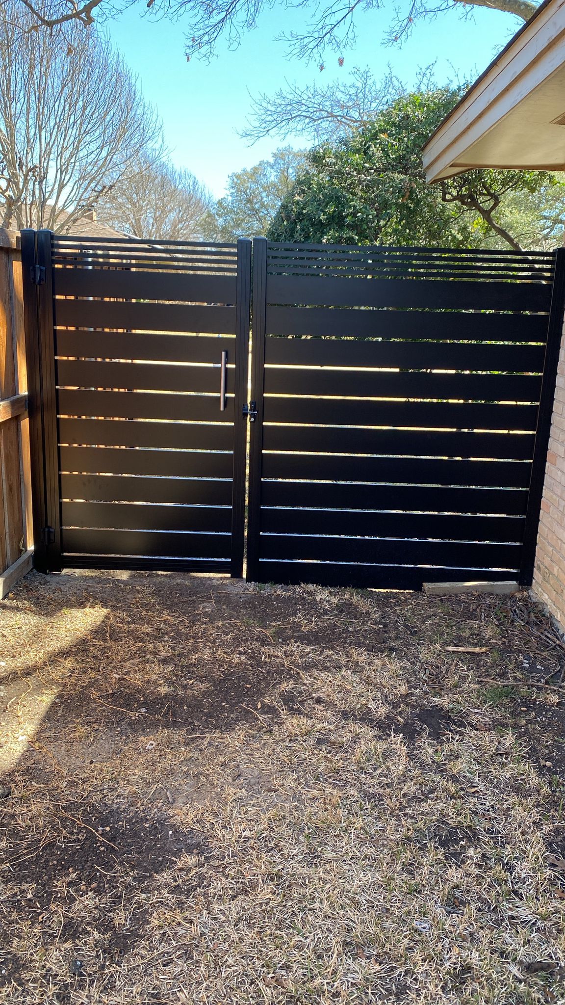 Dallas Style aluminum fence and gates. Part of it is 3’ height and the side is 6’ height. All made with 5.5” aluminum slats and 1” aluminum slats on top. All with ½” spacers. The color is flat black. Since the Dallas Style aluminum fence and gates are corrosion-proof, they can be installed outside. Customizable to one’s taste, it comes in a range of colors and styles.