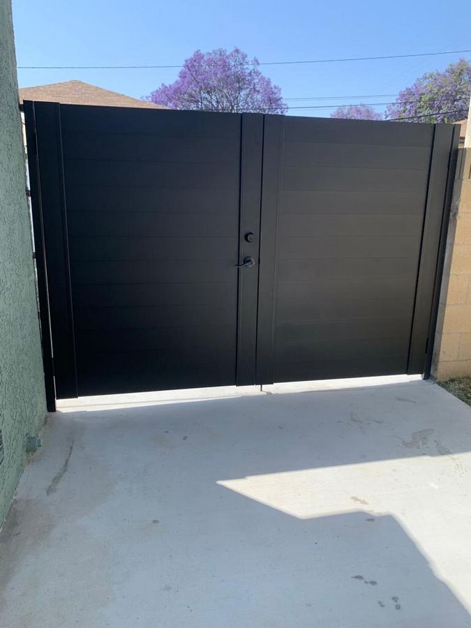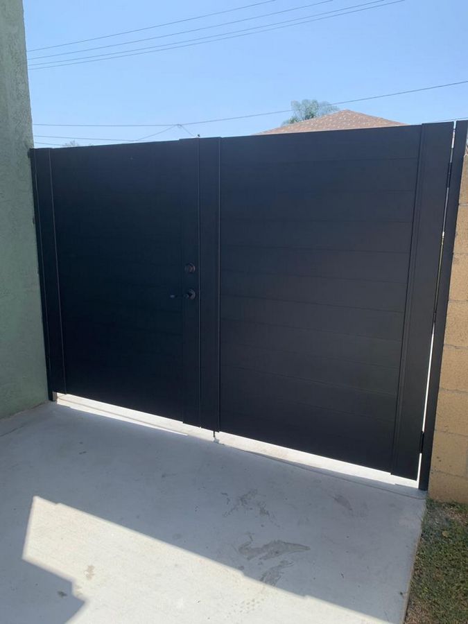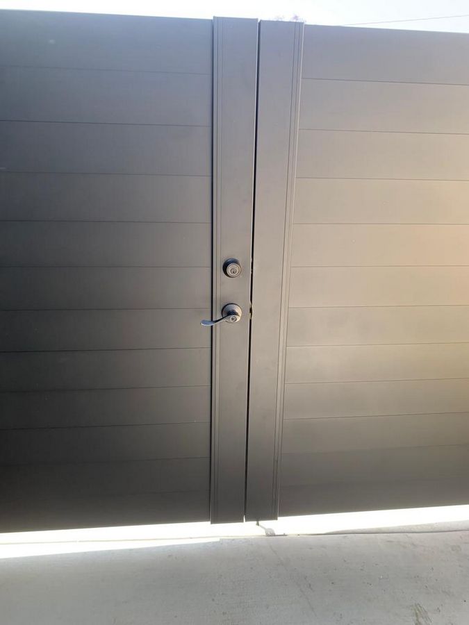 Full privacy 10’ wide aluminum driveway gates. Made with two 5’x6’ height swing gates. 5.5” aluminum slats with no gaps to get 100% privacy. Keyed lever and deadbolt was used for extra security.