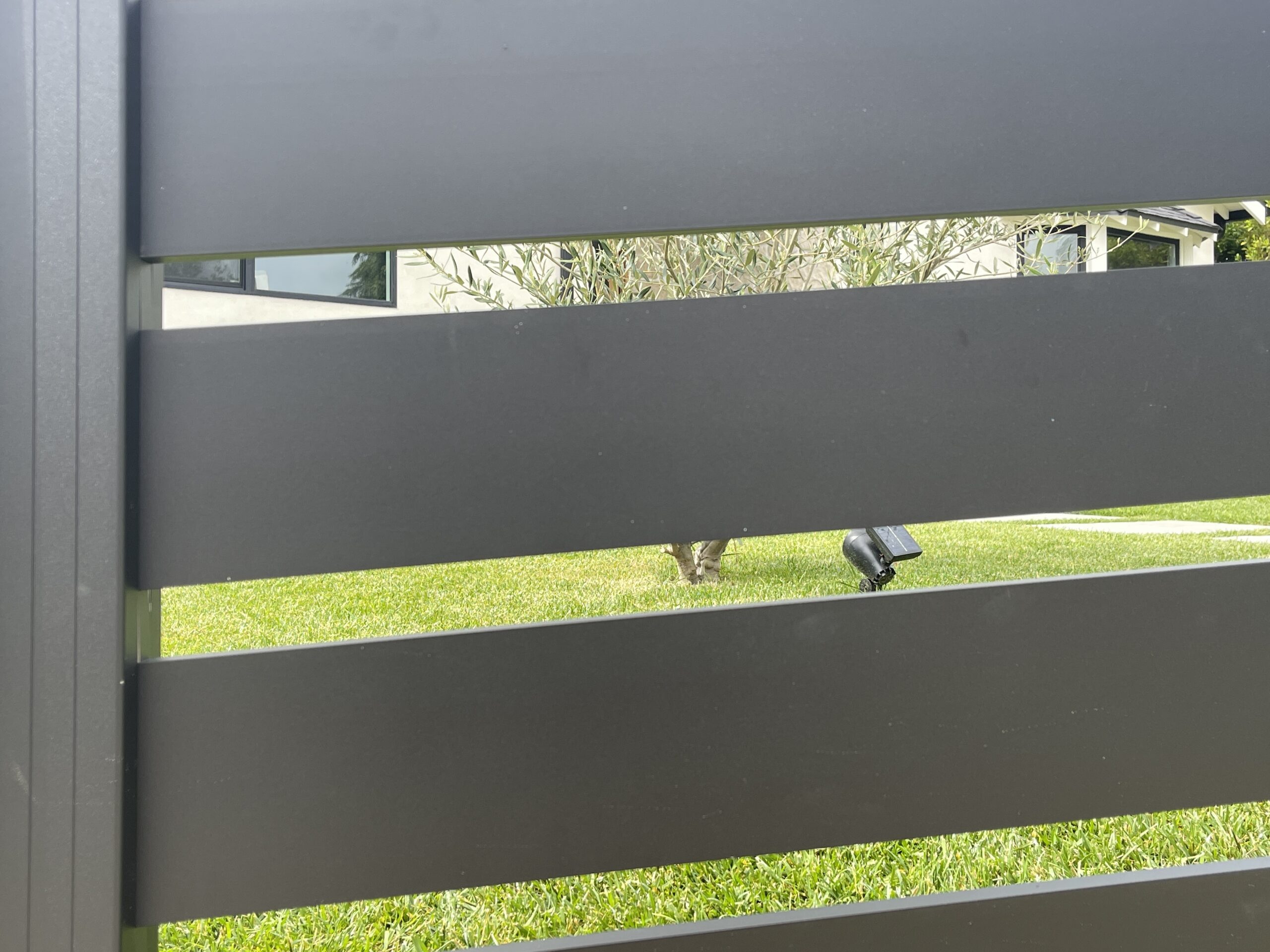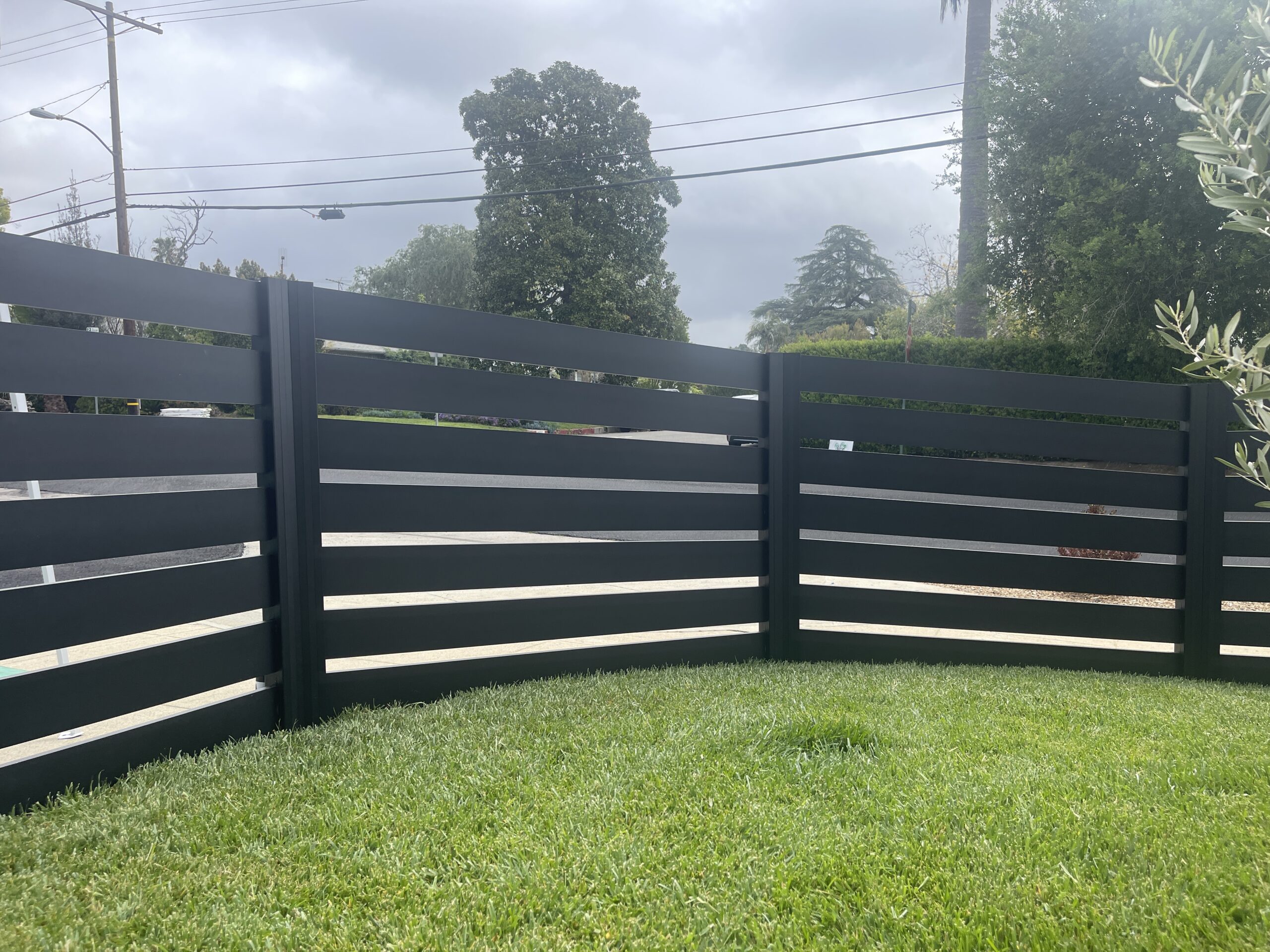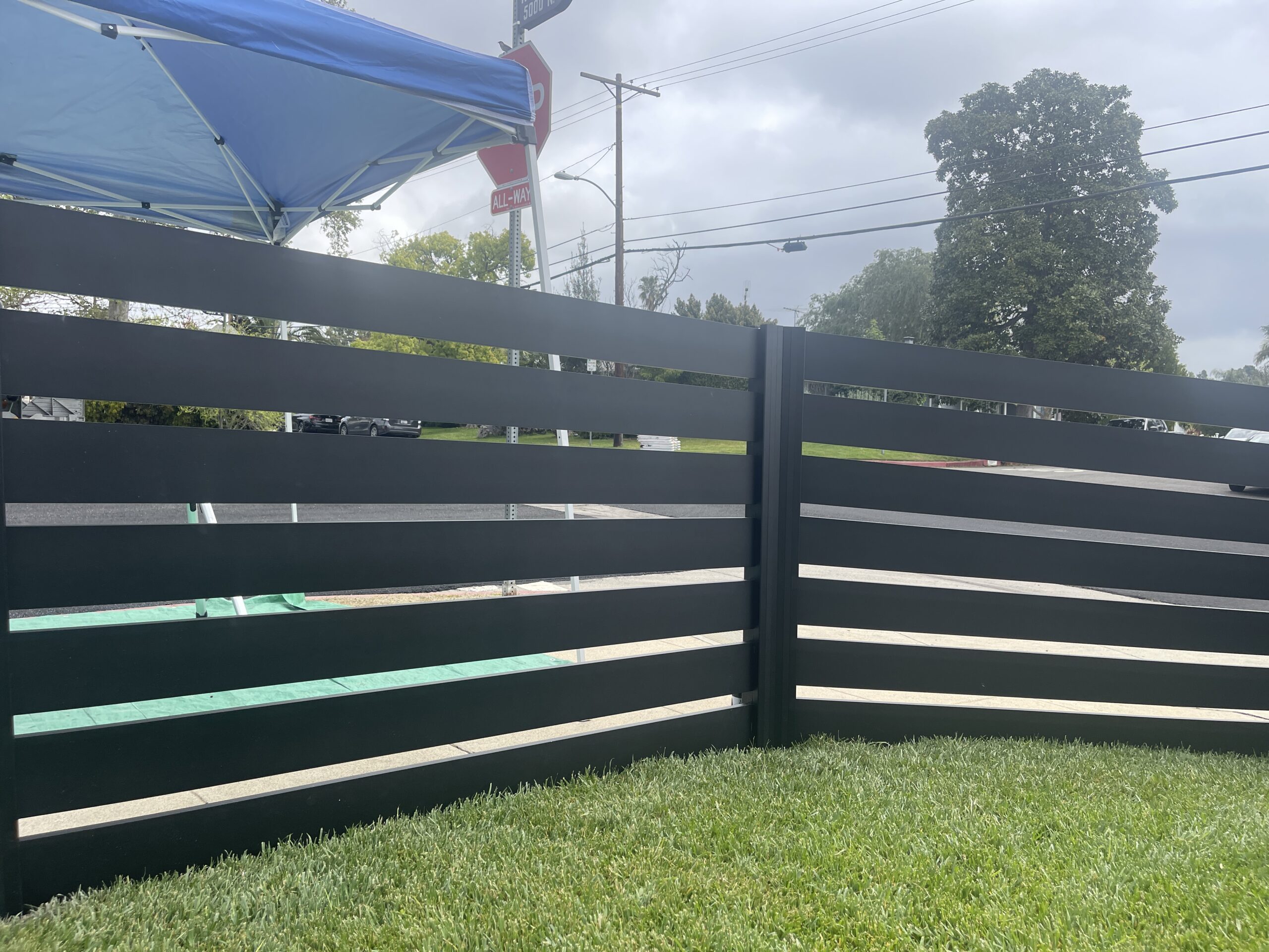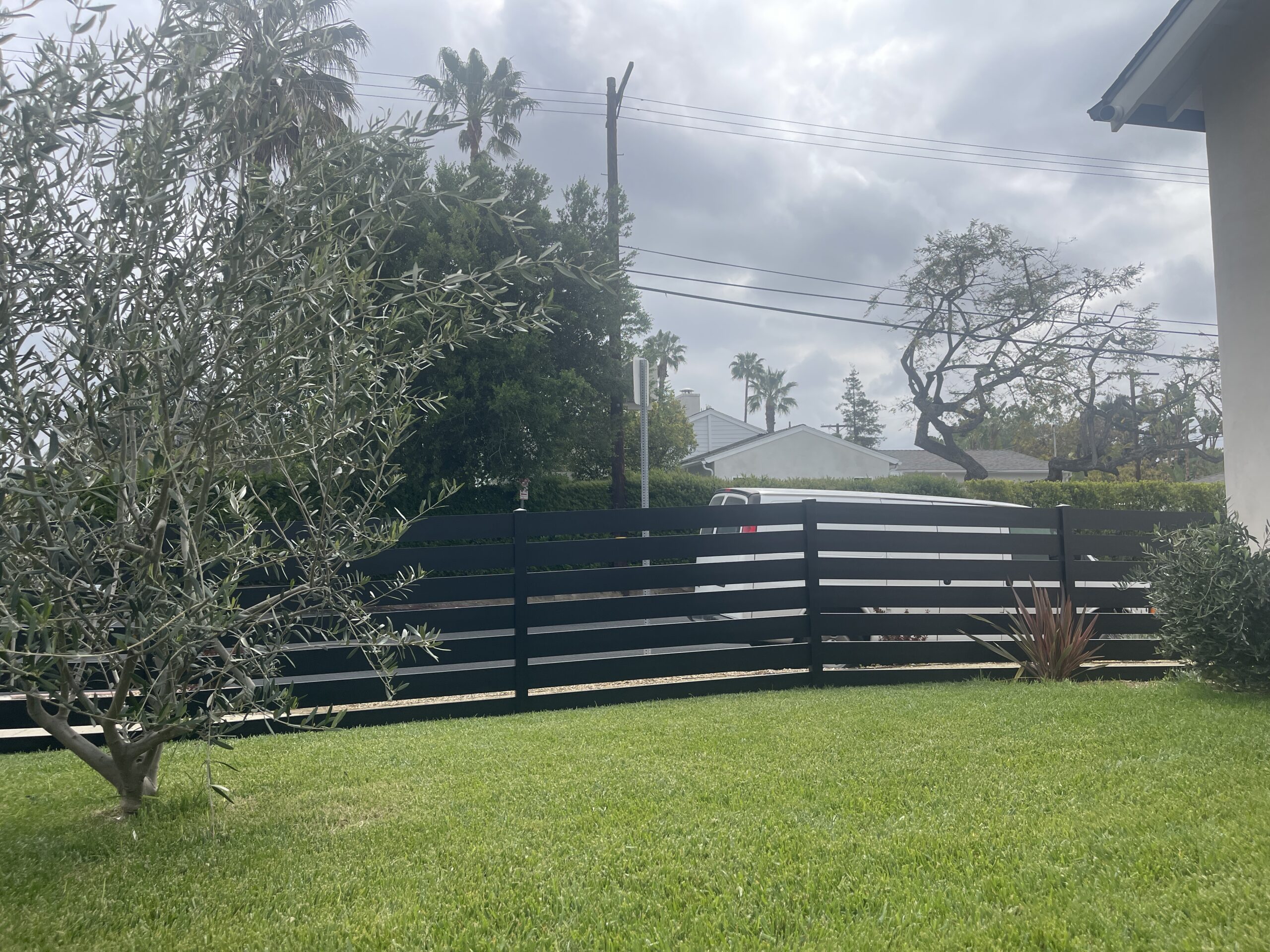 The Front Yard Aluminum Fence in North Hollywood, CA 91601, features a refined design that perfectly complements the modern aesthetic of the area. With a matte black finish and horizontal slats, this fence offers semi-privacy, allowing for enhanced security while maintaining a welcoming ambiance. The fence stands approximately 6 feet tall, providing an ideal balance between privacy and visibility, making it suitable for residential settings.