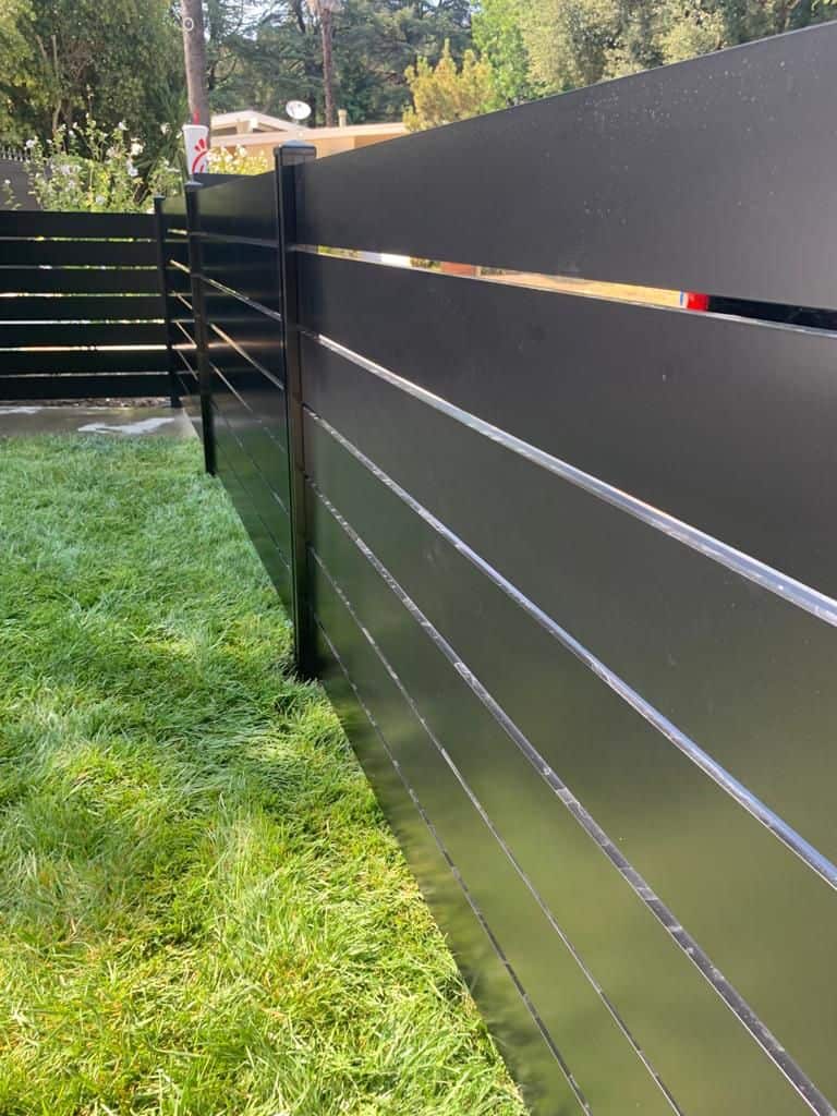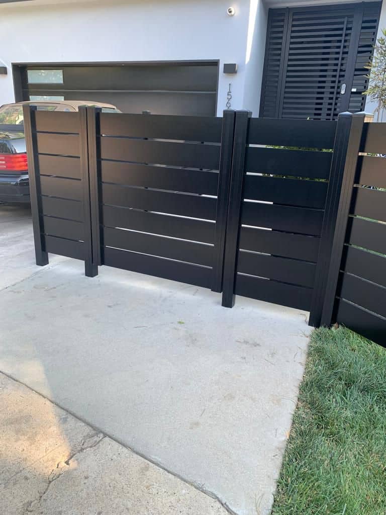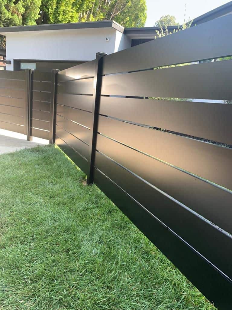 Matte black aluminum gate with horizontal slats, installed in a modern landscape.