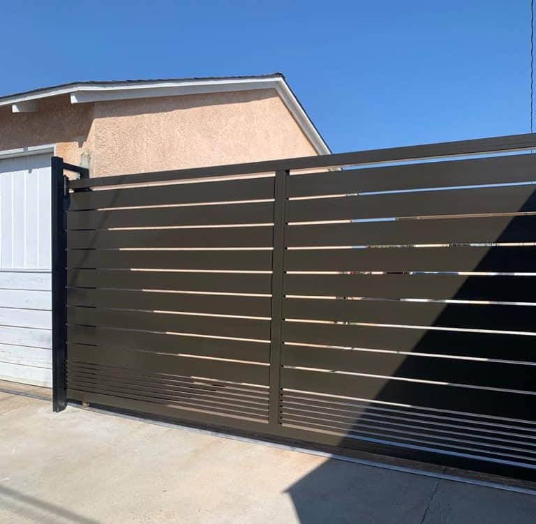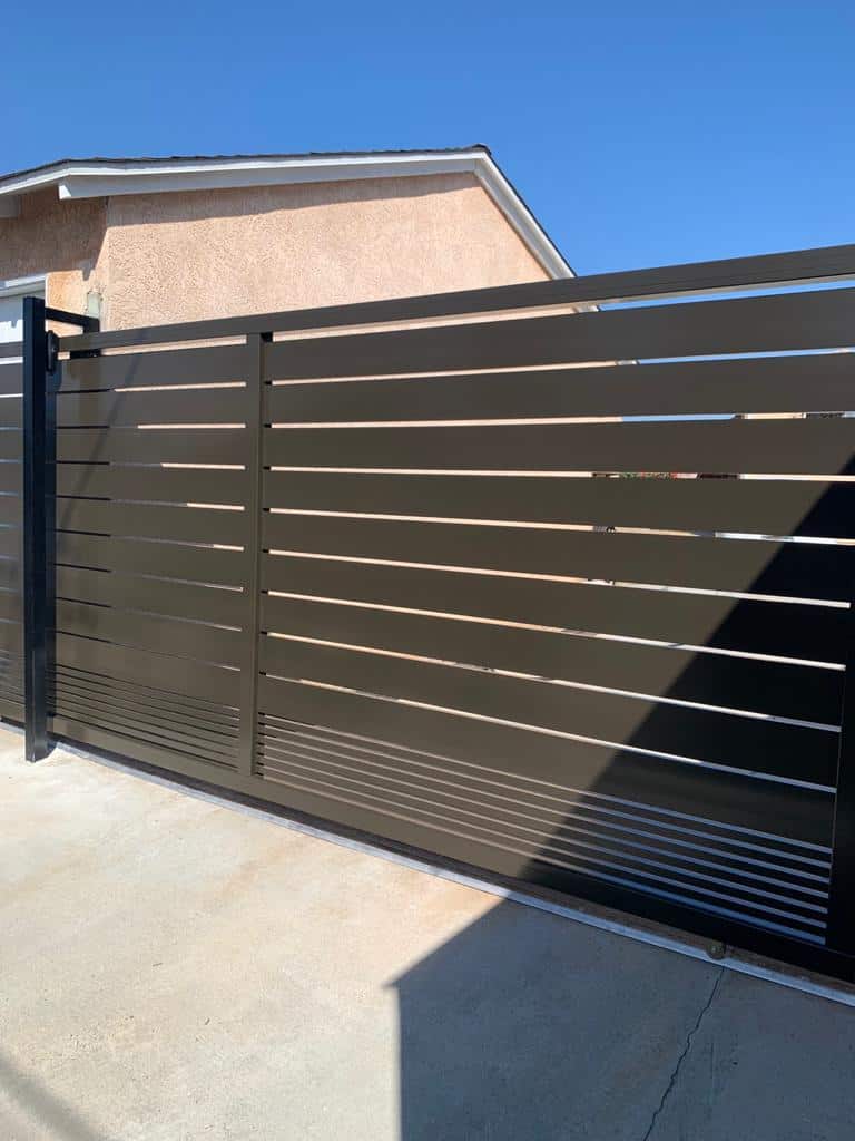 Matte black aluminum gate with horizontal slats, installed in a modern landscape.