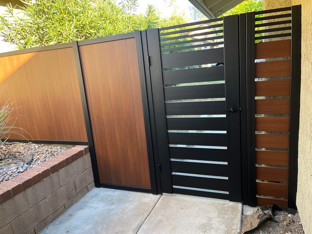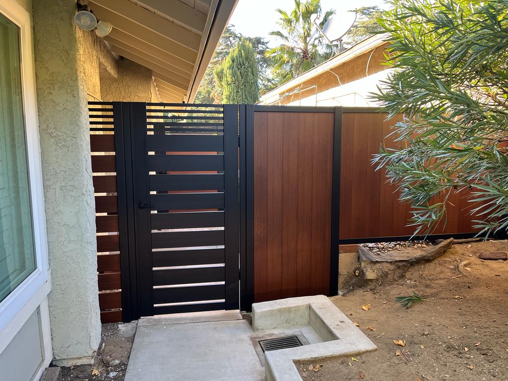 Our pedestrian gate, featuring a sophisticated blend of black and wood colors, is ideal for properties in Sylmar, CA 91342. The modern design incorporates horizontal aluminum slats with a durable matte black finish, framed by robust black aluminum posts. This not only enhances privacy but also complements various architectural styles effortlessly, including stucco homes with concrete pathways. Standing approximately 6 feet tall, it merges functionality with aesthetic appeal, providing an elegant barrier that seamlessly integrates with its surroundings in any Sylmar neighborhood. Perfect for homeowners seeking a stylish yet practical entryway solution.