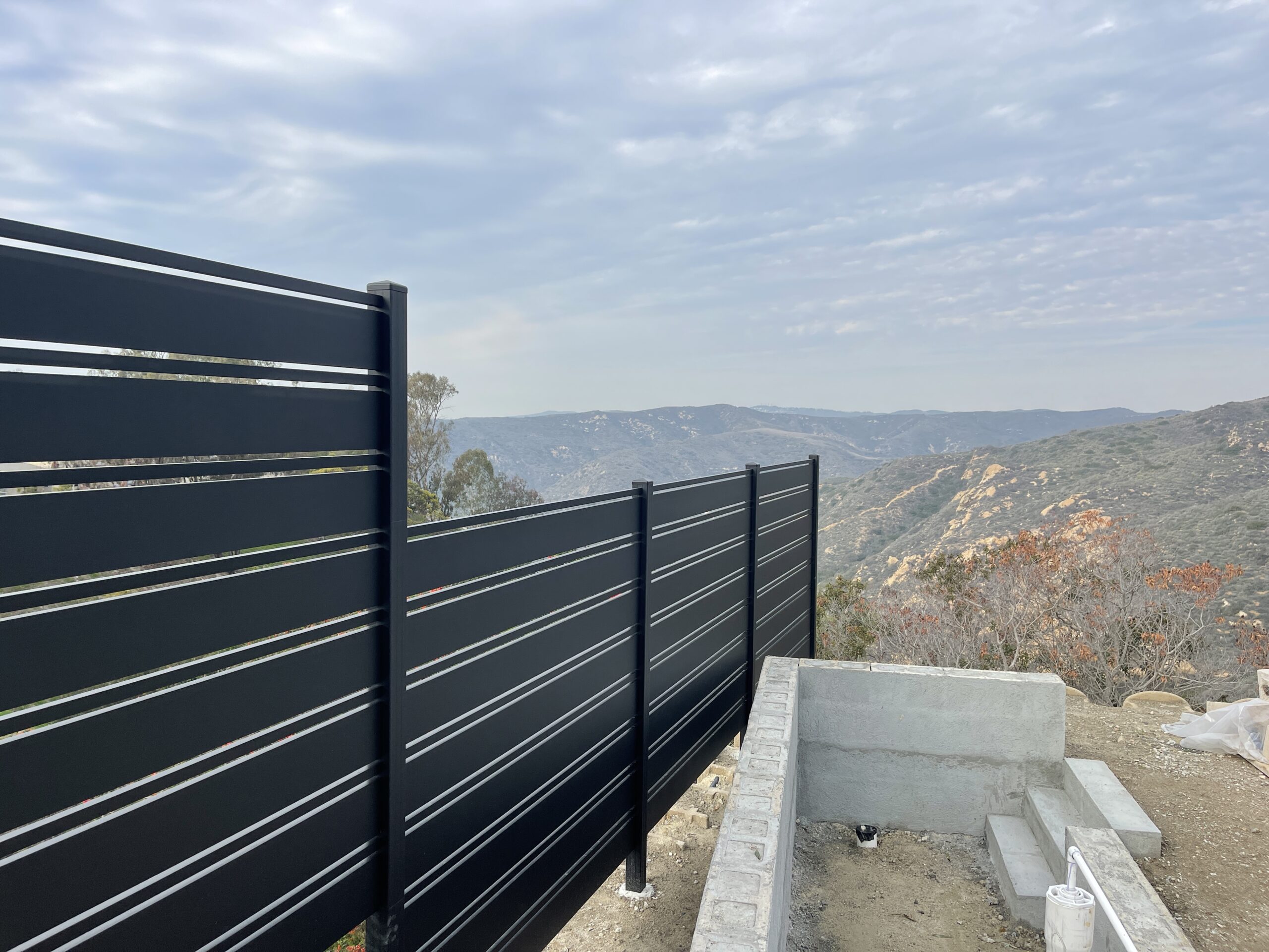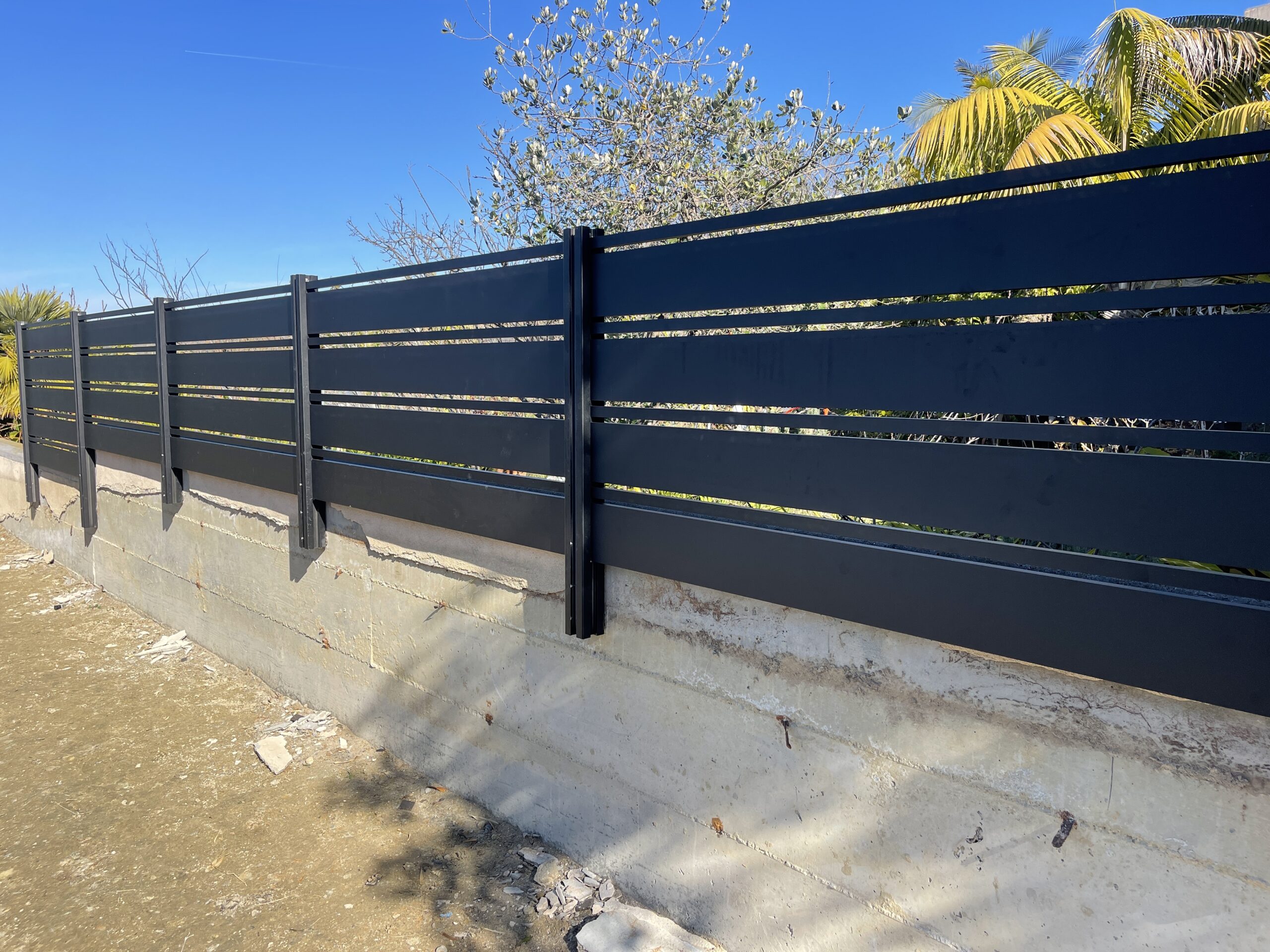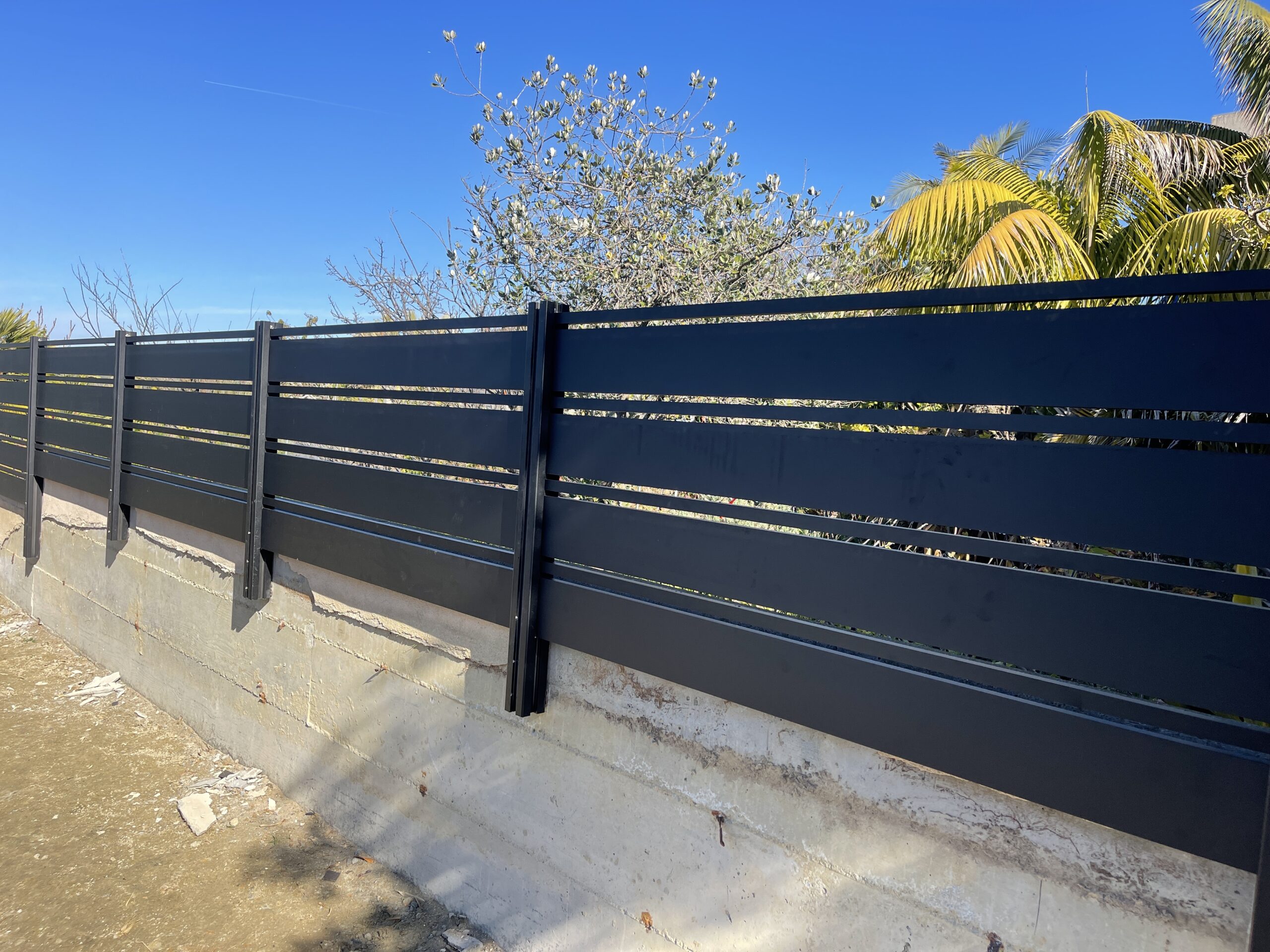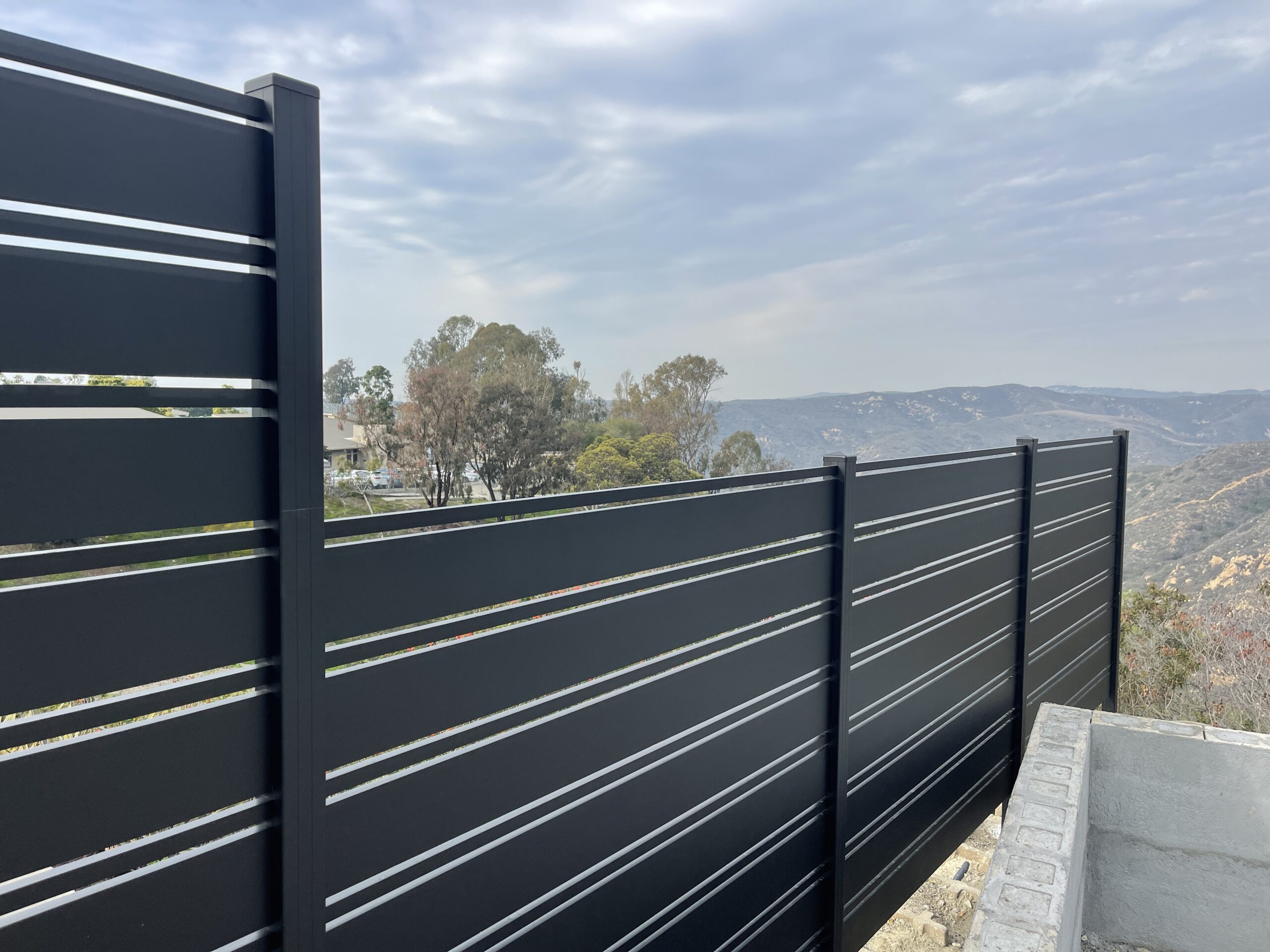 Elevate the security and aesthetic appeal of your property with our Miami style perimeter fence in black, located in Laguna Beach, CA 92651. This modern fence, constructed with horizontal aluminum slats, exudes a sleek matte black finish, reflecting contemporary elegance typical of the Dallas style. With wide solid panels interspersed with narrower horizontal slats, the design not only provides functional durability but also seamlessly integrates with landscaped settings. Mounted on a concrete base, this perimeter fence offers enhanced stability and height, while strategically placed vegetation adds a natural touch of privacy. Choose our aluminum fences and gates for lifetime strength, modern design flexibility, and low maintenance. Experience unparalleled versatility with customizable options designed to enhance your property’s overall appearance and security. Contact us today to modernize your property’s perimeter with a durable and stylish aluminum fence.