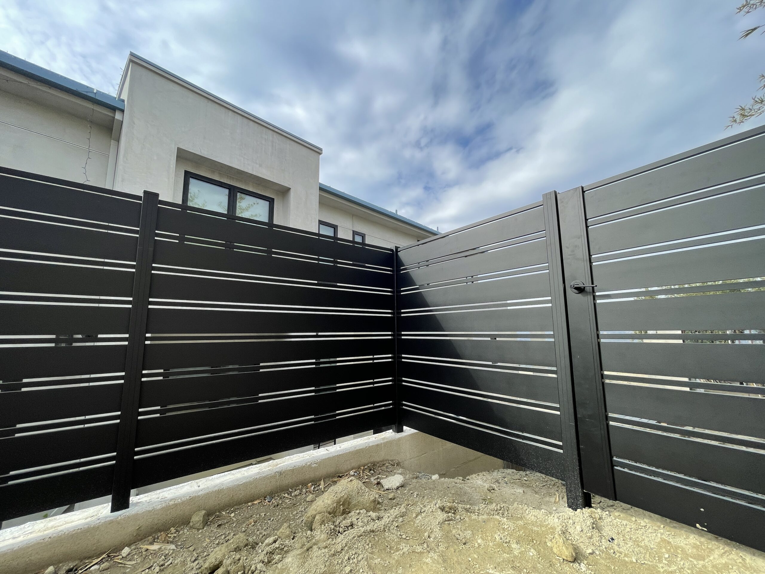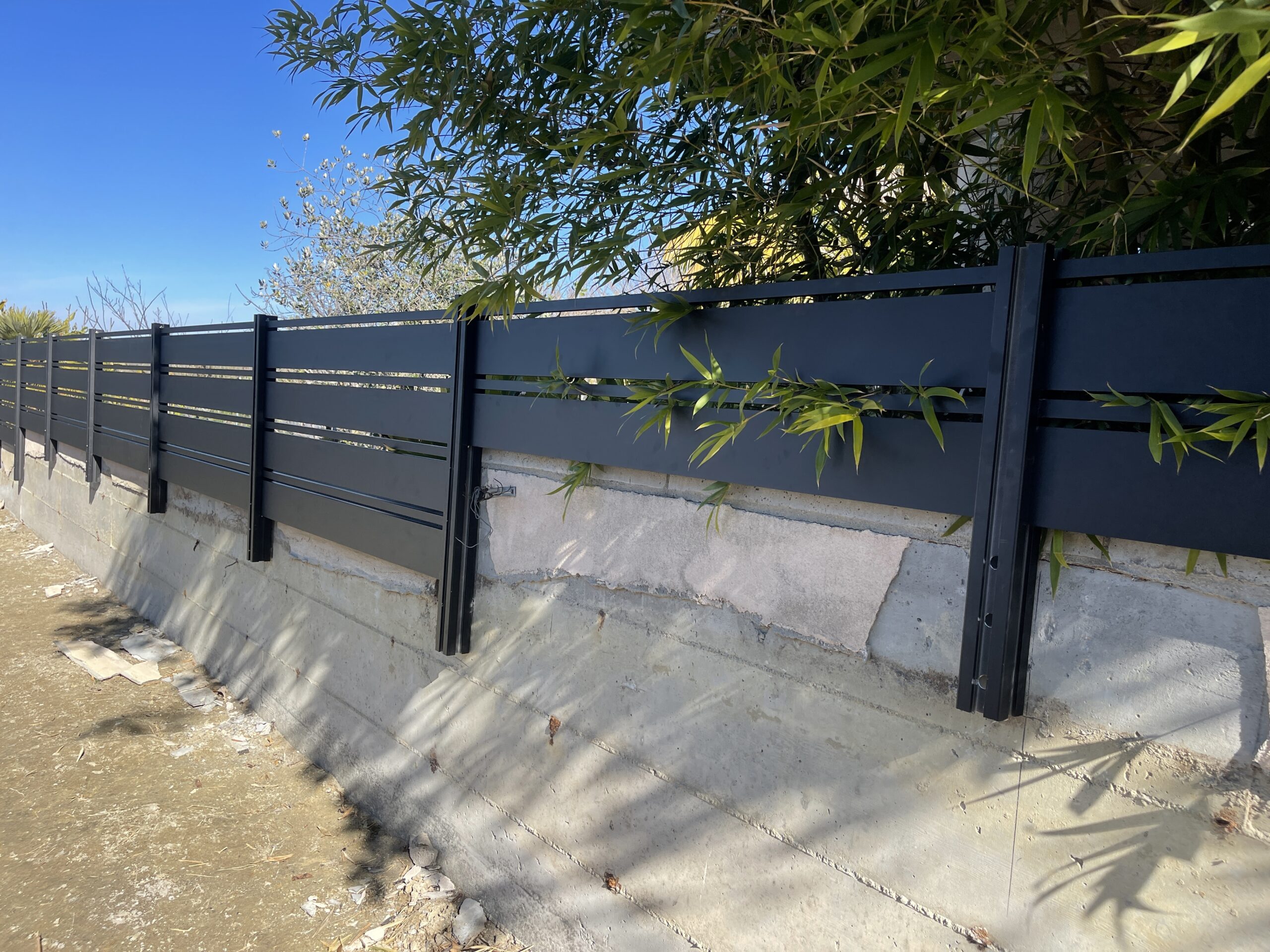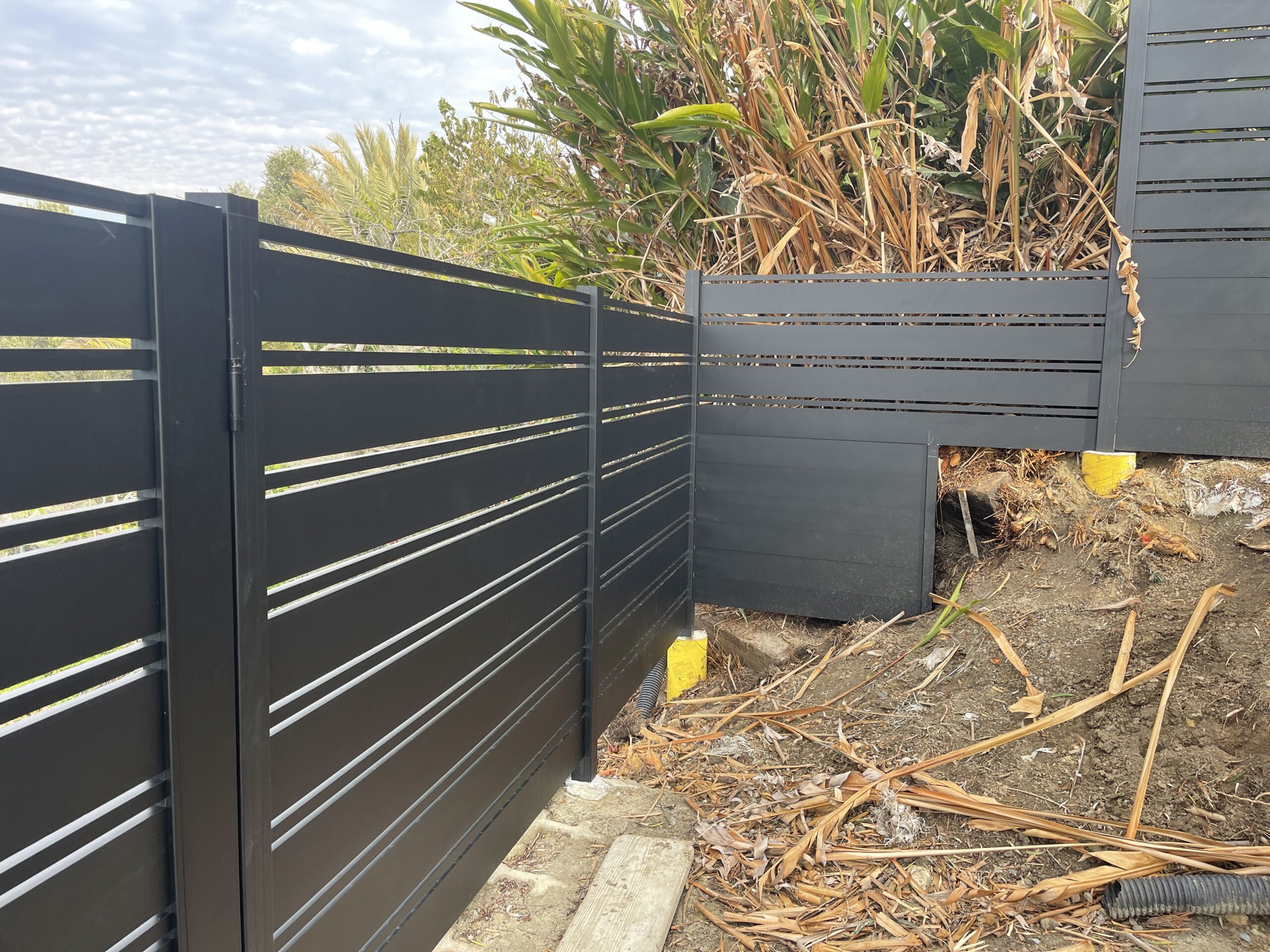 Elevate the security and aesthetic appeal of your property with our Miami style perimeter fence in black, located in Laguna Beach, CA 92651. This modern fence, constructed with horizontal aluminum slats, exudes a sleek matte black finish, reflecting contemporary elegance typical of the Dallas style. With wide solid panels interspersed with narrower horizontal slats, the design not only provides functional durability but also seamlessly integrates with landscaped settings. Mounted on a concrete base, this perimeter fence offers enhanced stability and height, while strategically placed vegetation adds a natural touch of privacy. Choose our aluminum fences and gates for lifetime strength, modern design flexibility, and low maintenance. Experience unparalleled versatility with customizable options designed to enhance your property’s overall appearance and security. Contact us today to modernize your property’s perimeter with a durable and stylish aluminum fence.