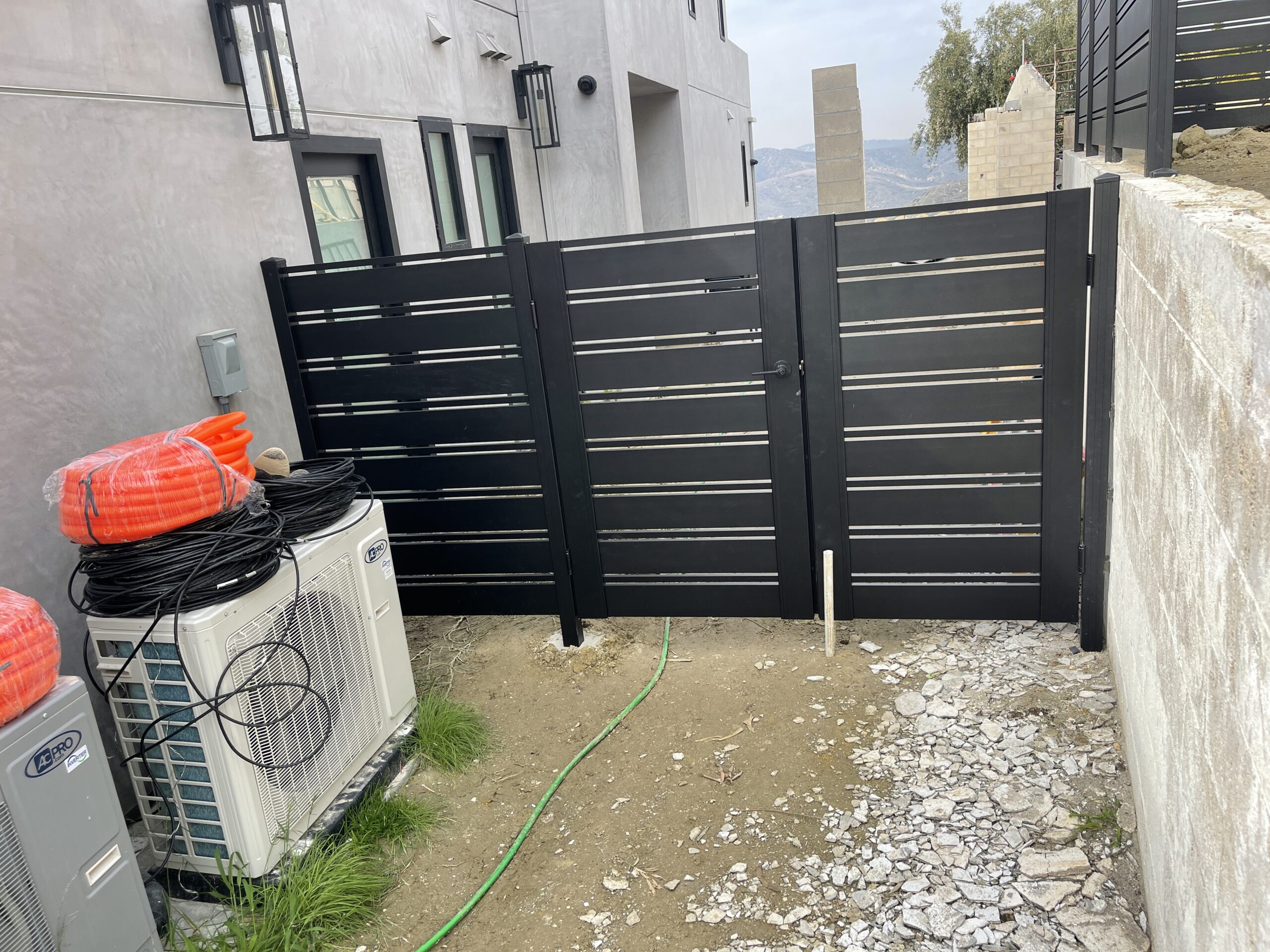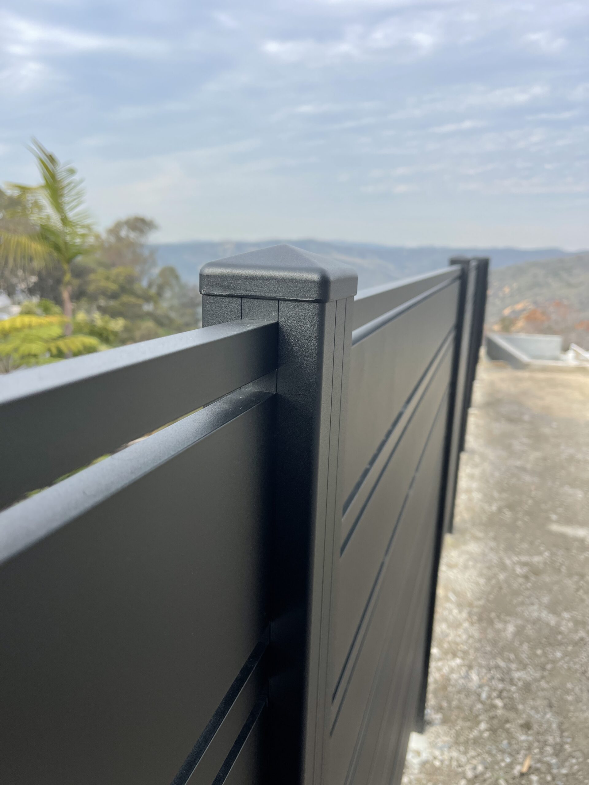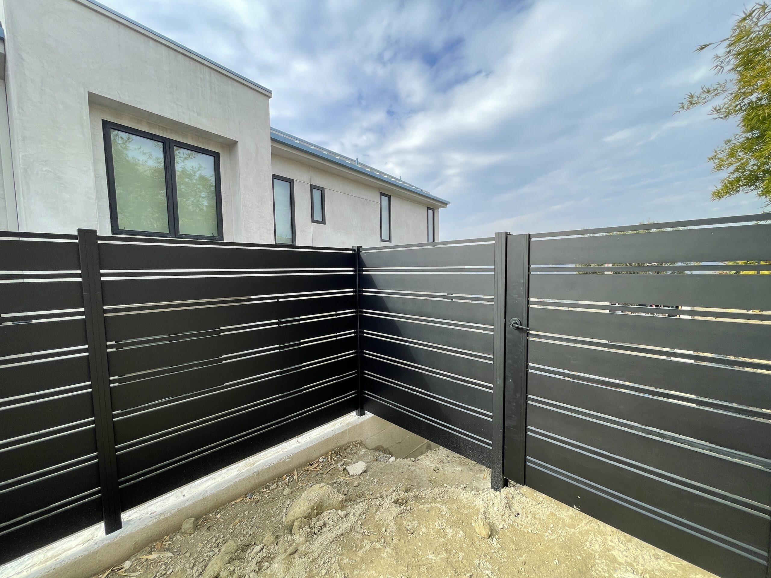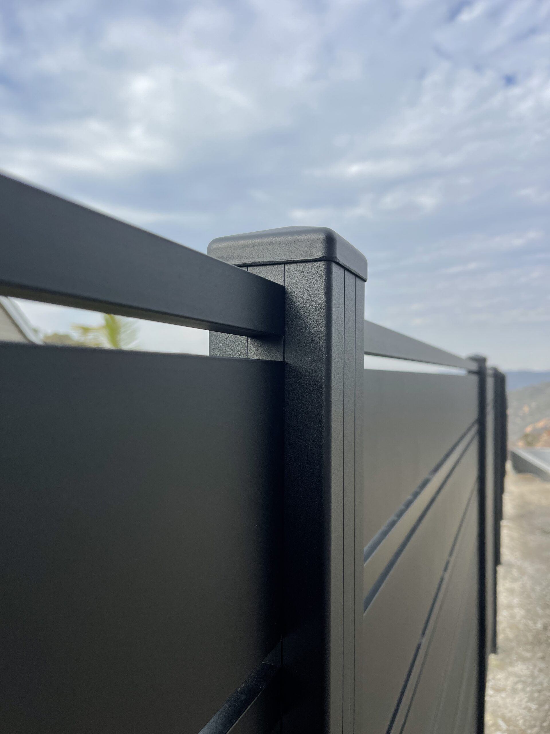 Elevate the security and aesthetic appeal of your property with our Miami style perimeter fence in black, located in Laguna Beach, CA 92651. This modern fence, constructed with horizontal aluminum slats, exudes a sleek matte black finish, reflecting contemporary elegance typical of the Dallas style. With wide solid panels interspersed with narrower horizontal slats, the design not only provides functional durability but also seamlessly integrates with landscaped settings. Mounted on a concrete base, this perimeter fence offers enhanced stability and height, while strategically placed vegetation adds a natural touch of privacy. Choose our aluminum fences and gates for lifetime strength, modern design flexibility, and low maintenance. Experience unparalleled versatility with customizable options designed to enhance your property’s overall appearance and security. Contact us today to modernize your property’s perimeter with a durable and stylish aluminum fence.