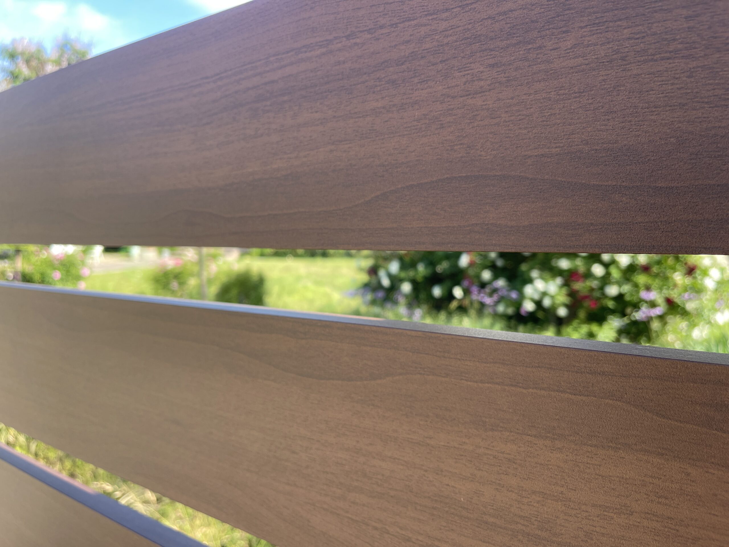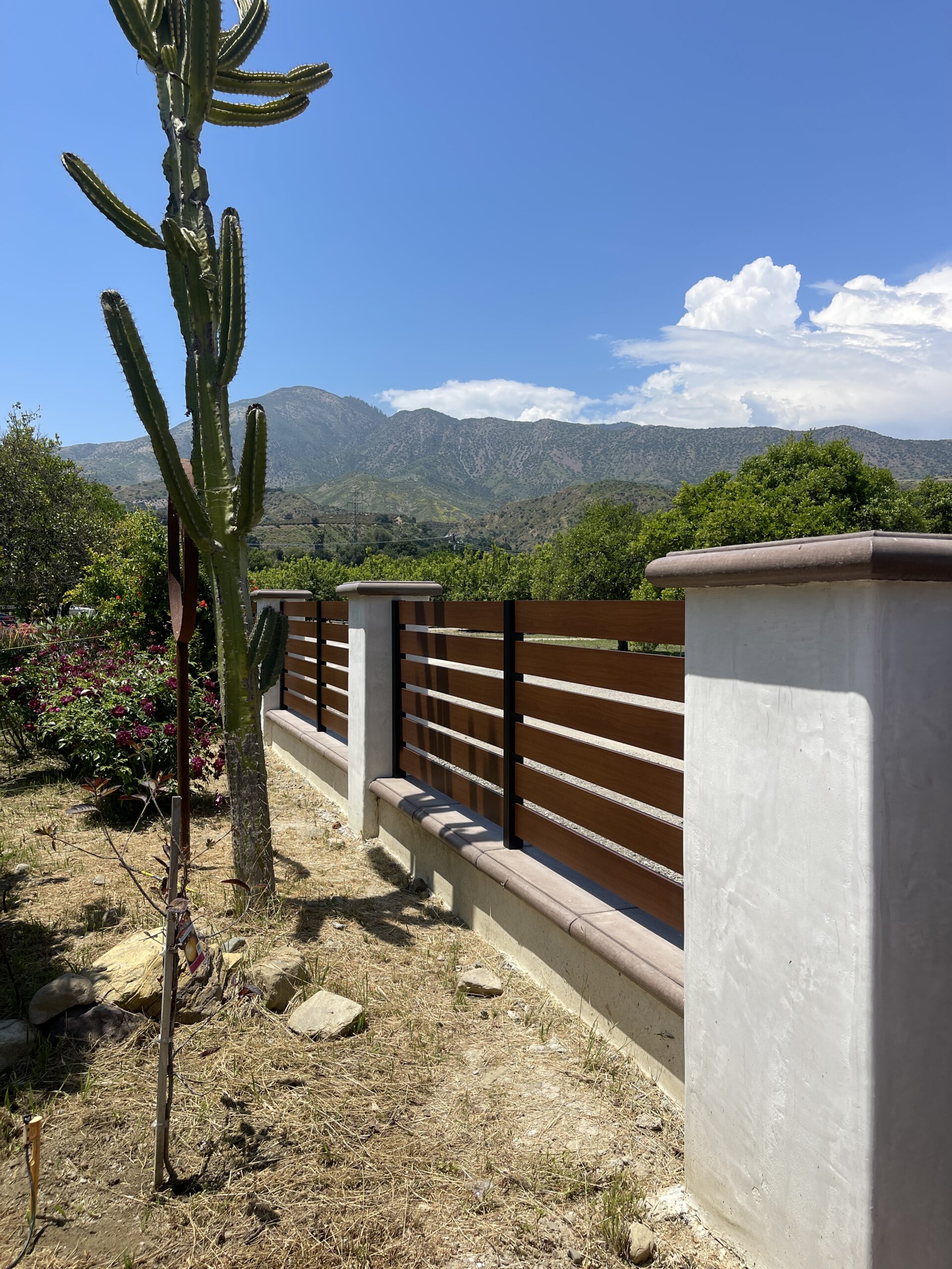 5.5″ powder coated aluminum slats lok like wood with 1-1/2″ spacing between the slats. 42″ height fence between the columns and large 10′ opening with double swing gates of 5’x5′ each gate.